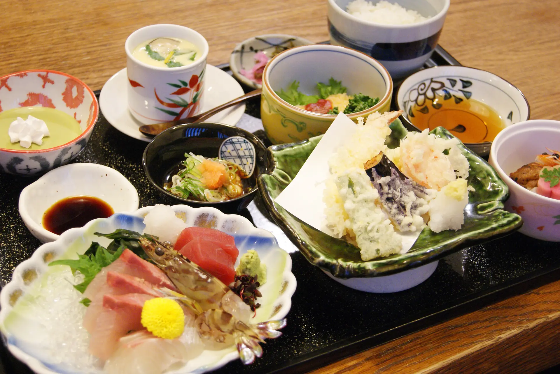 こちらがお店の人気メニュー「とも舎御膳」(2,200円/税別)です。お造りや天ぷら、炊き合わせなどなど、てんこ盛りの内容!