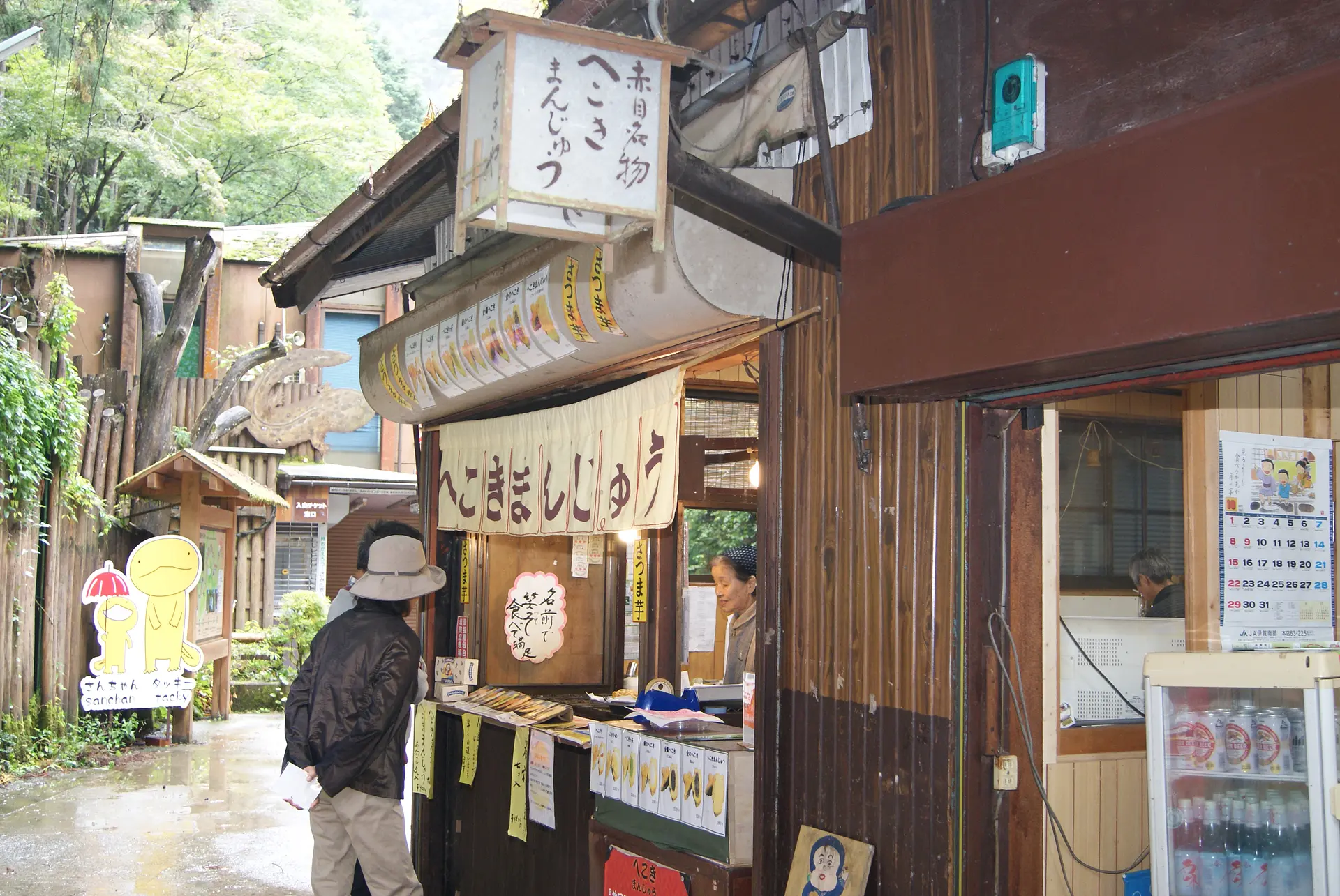 ご当地キャラの「さんちゃん」と「タッキー」が出迎えてくれています。