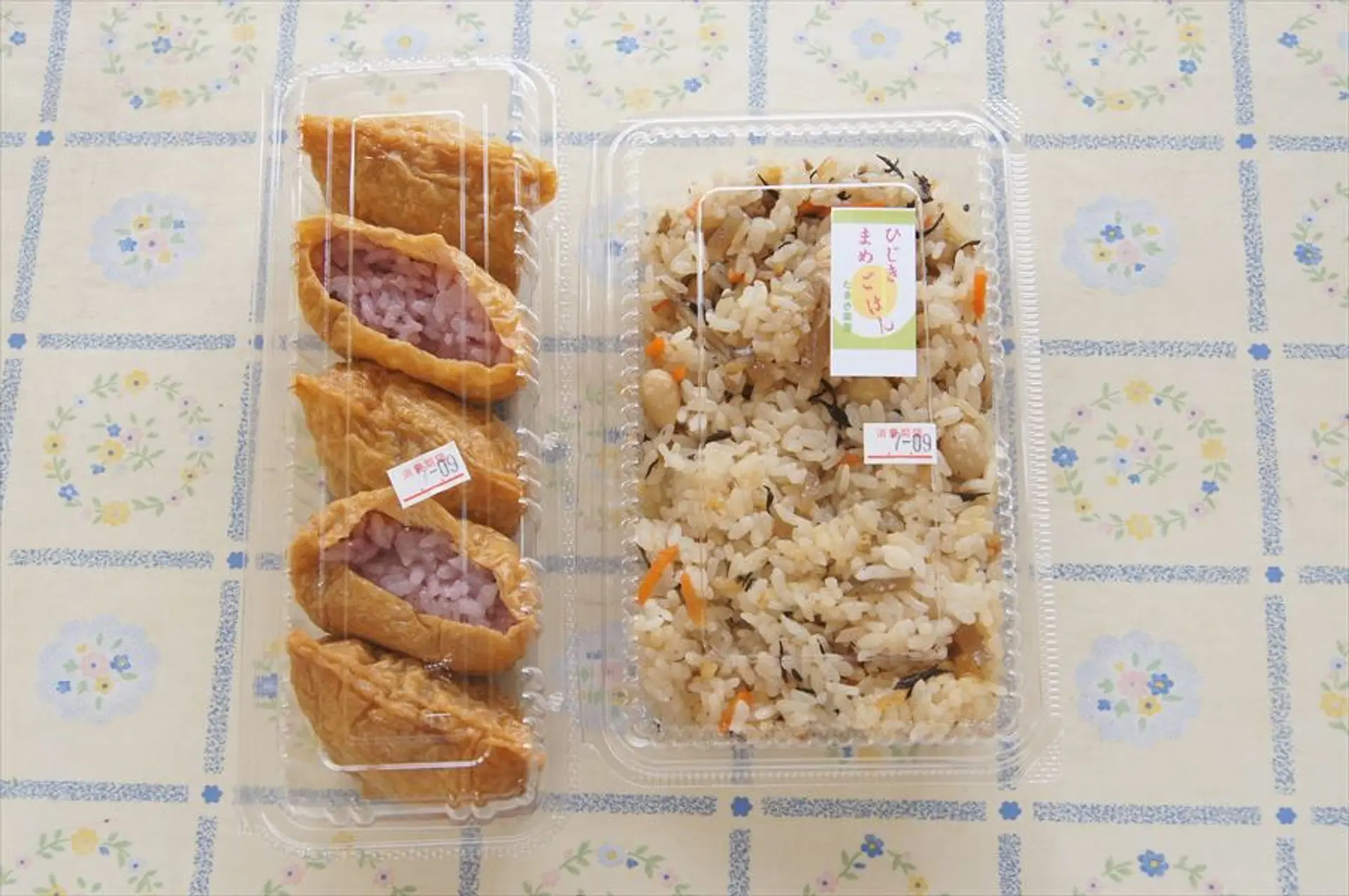 写真は「ひじきまめごはん」。古代米はモチっとおいしく、いなり寿司にぴったりです。