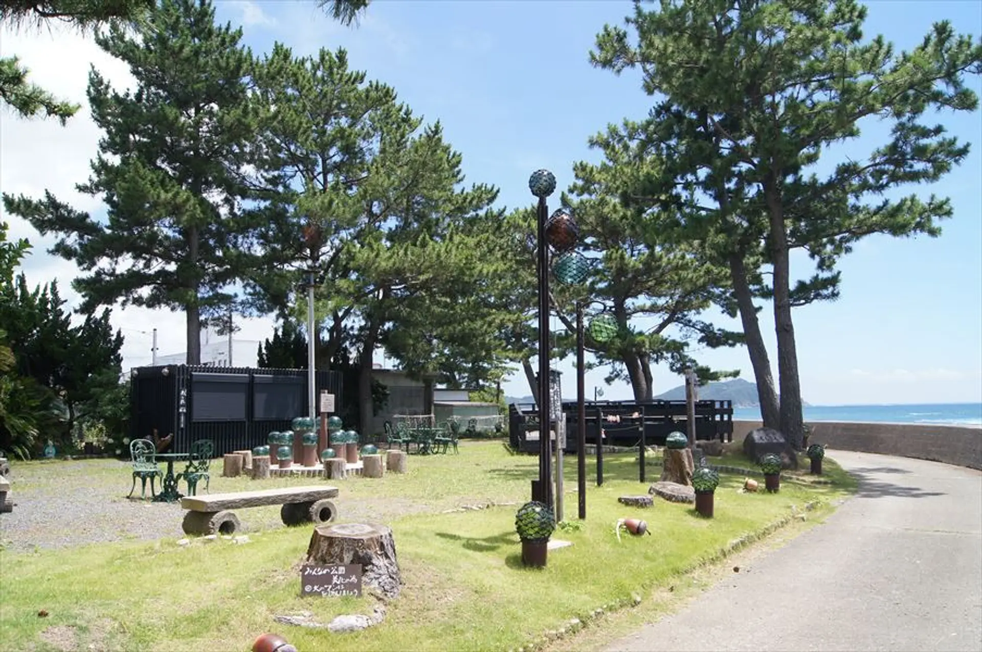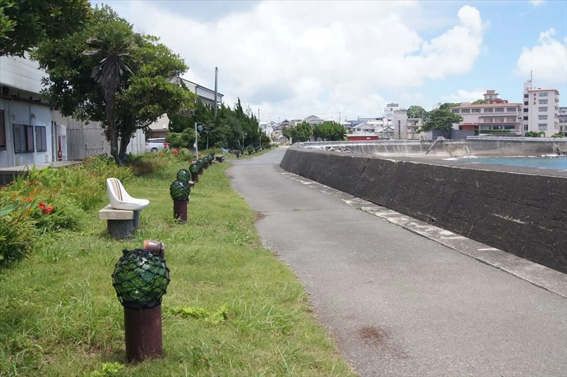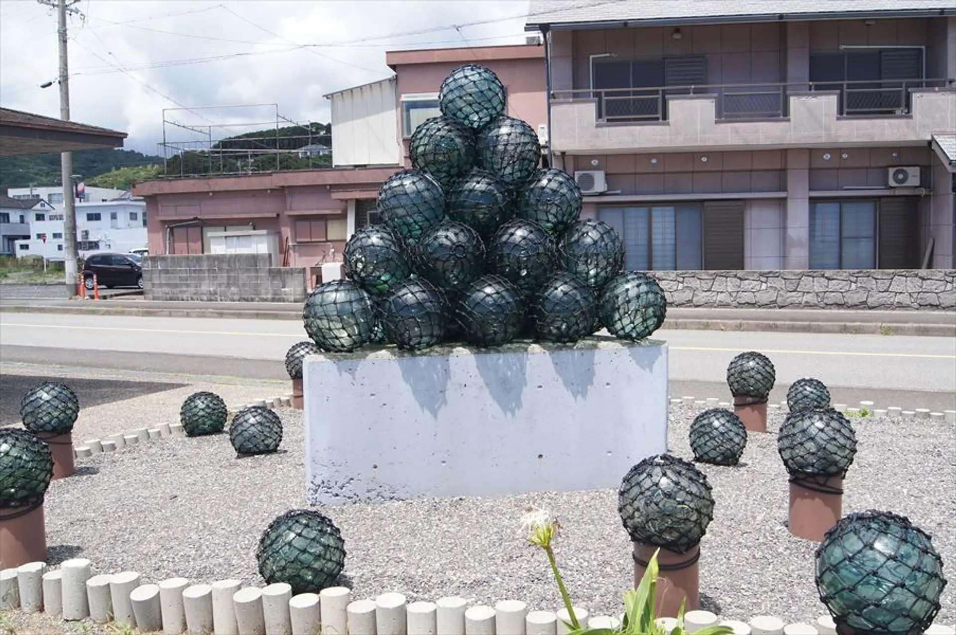 真珠養殖などの漁具として使われていた「ビン玉」がオブジェとして使われています。
