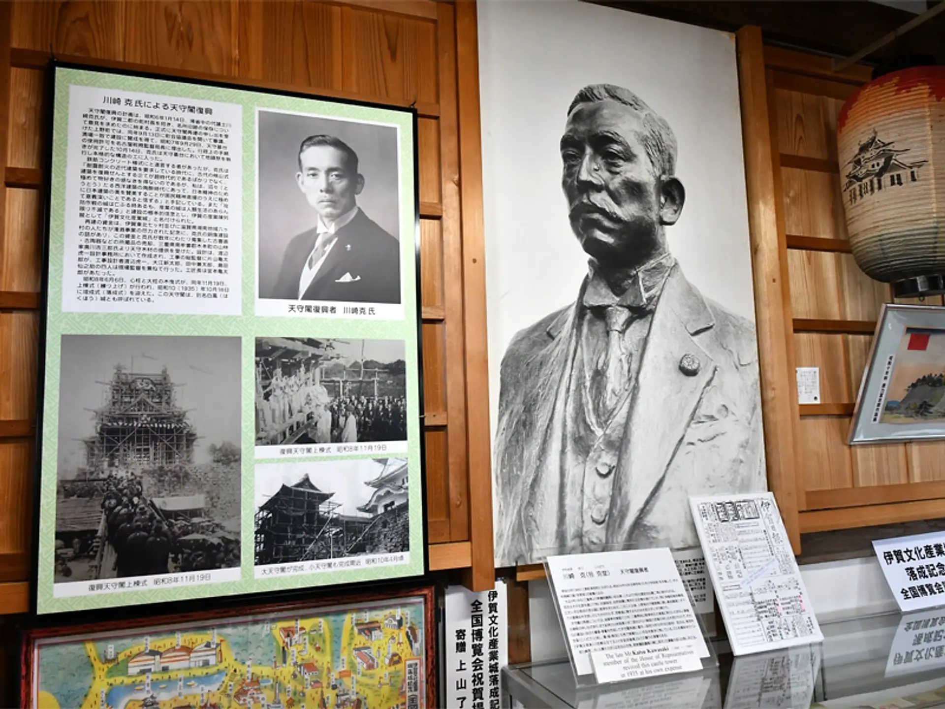現在の天守閣は、1935(昭和10)年に伊賀出身の代議士・川崎克(かわさき かつ)が、” 攻防作戦の城は亡びることもあるが、産業の城は人類生活のあらん限り不滅 ” の信念のもと、私財と支援者の協力を得ながら復興した木造建築による模擬天守なんです。
