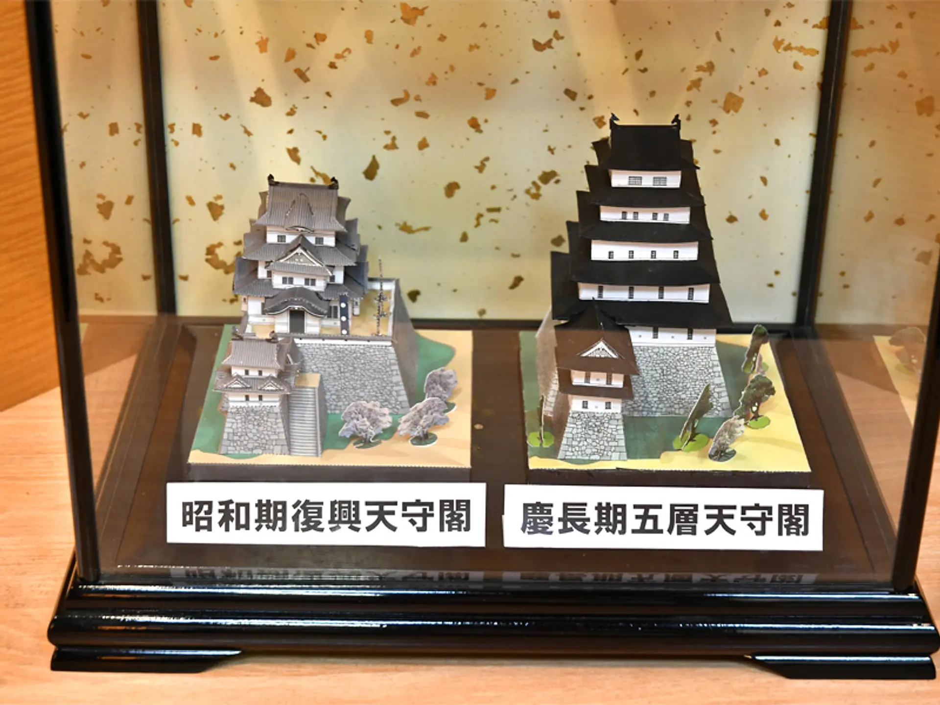また、「忍びの井戸」の横には藤堂高虎が造ろうとした5層の天守と現在の天守のペーパークラフトが並べて展示されています。