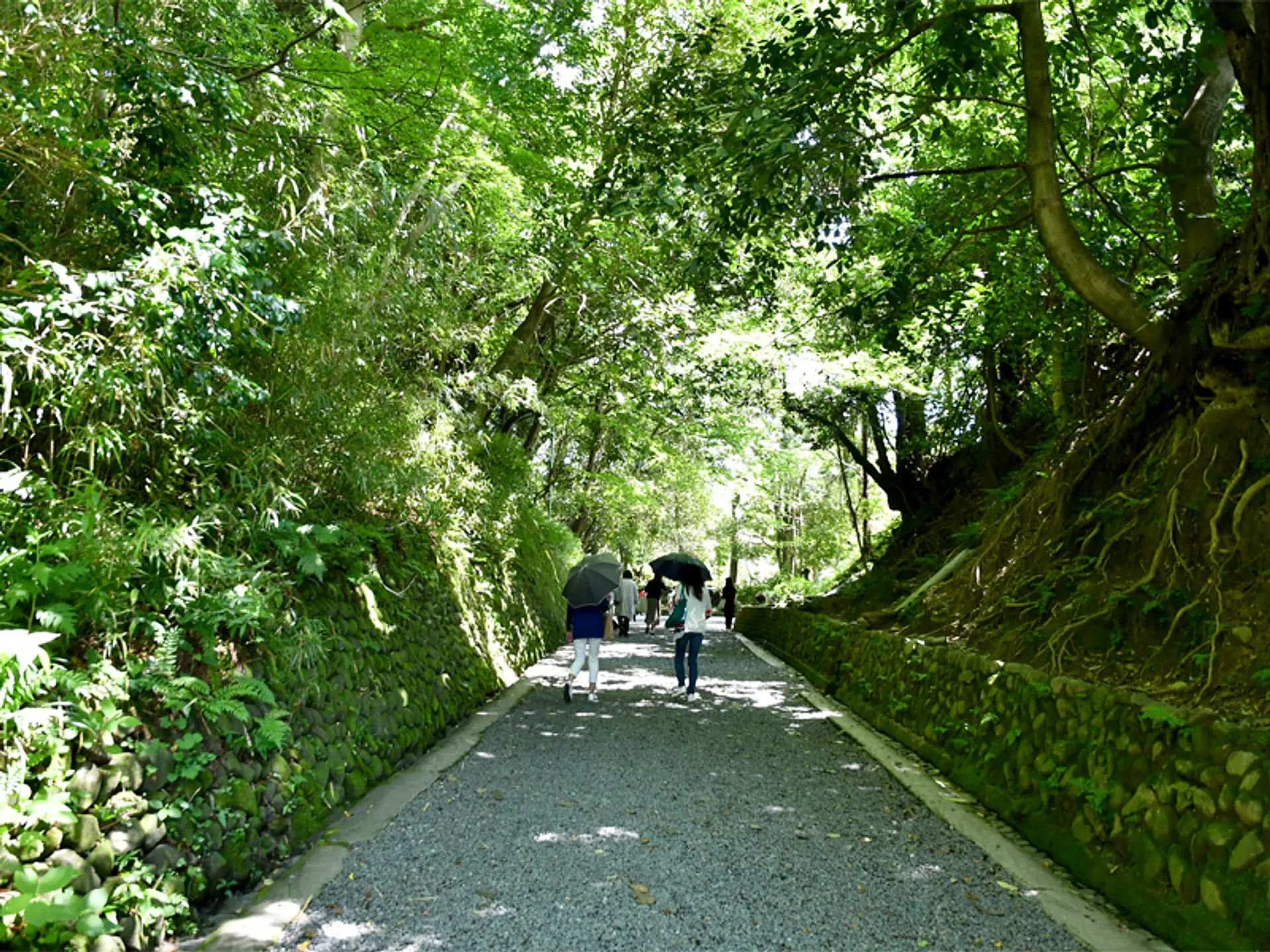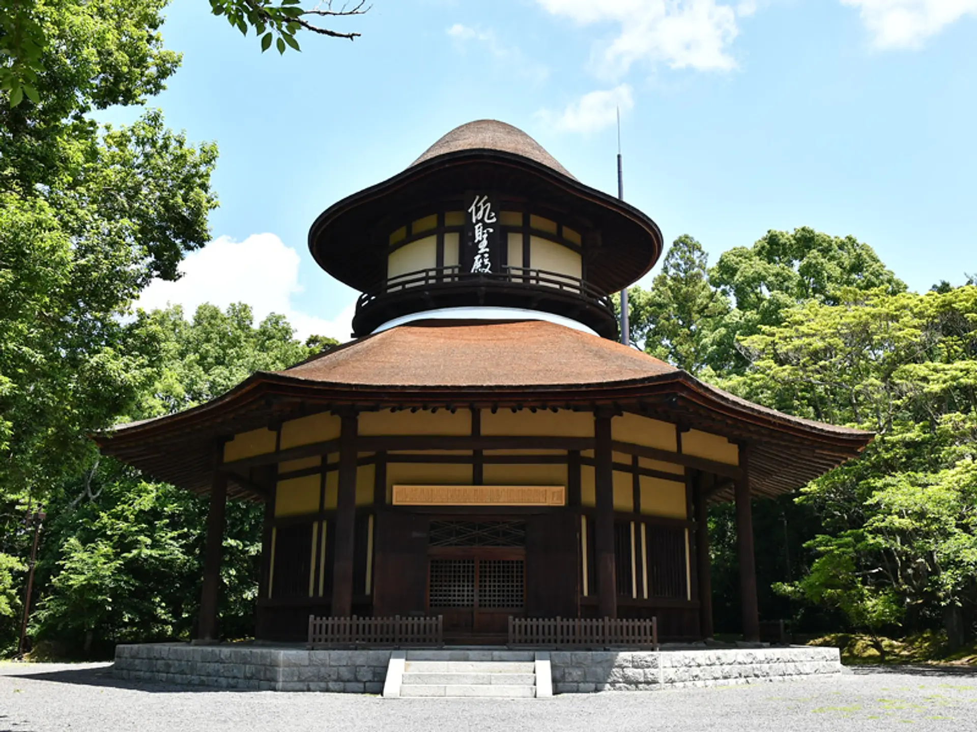 登りづらいようにわざと段差や幅に違いをつけてある石階段を下って、芭蕉生誕300年を記念して1942年に建造された俳聖殿(はいせいでん)に向かいます。