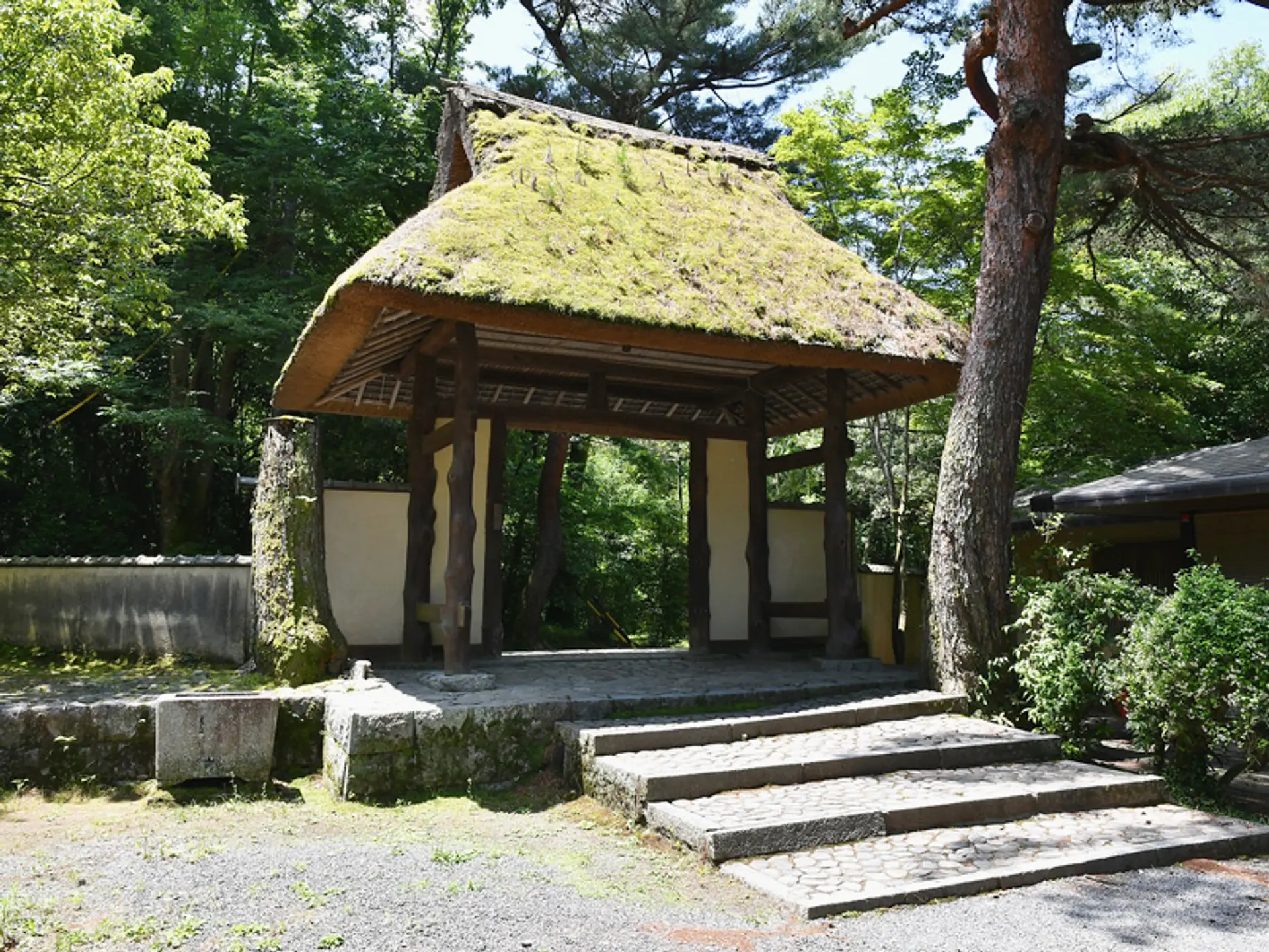 俳聖殿入口にあたる門。かやぶき屋根が趣がありますね。