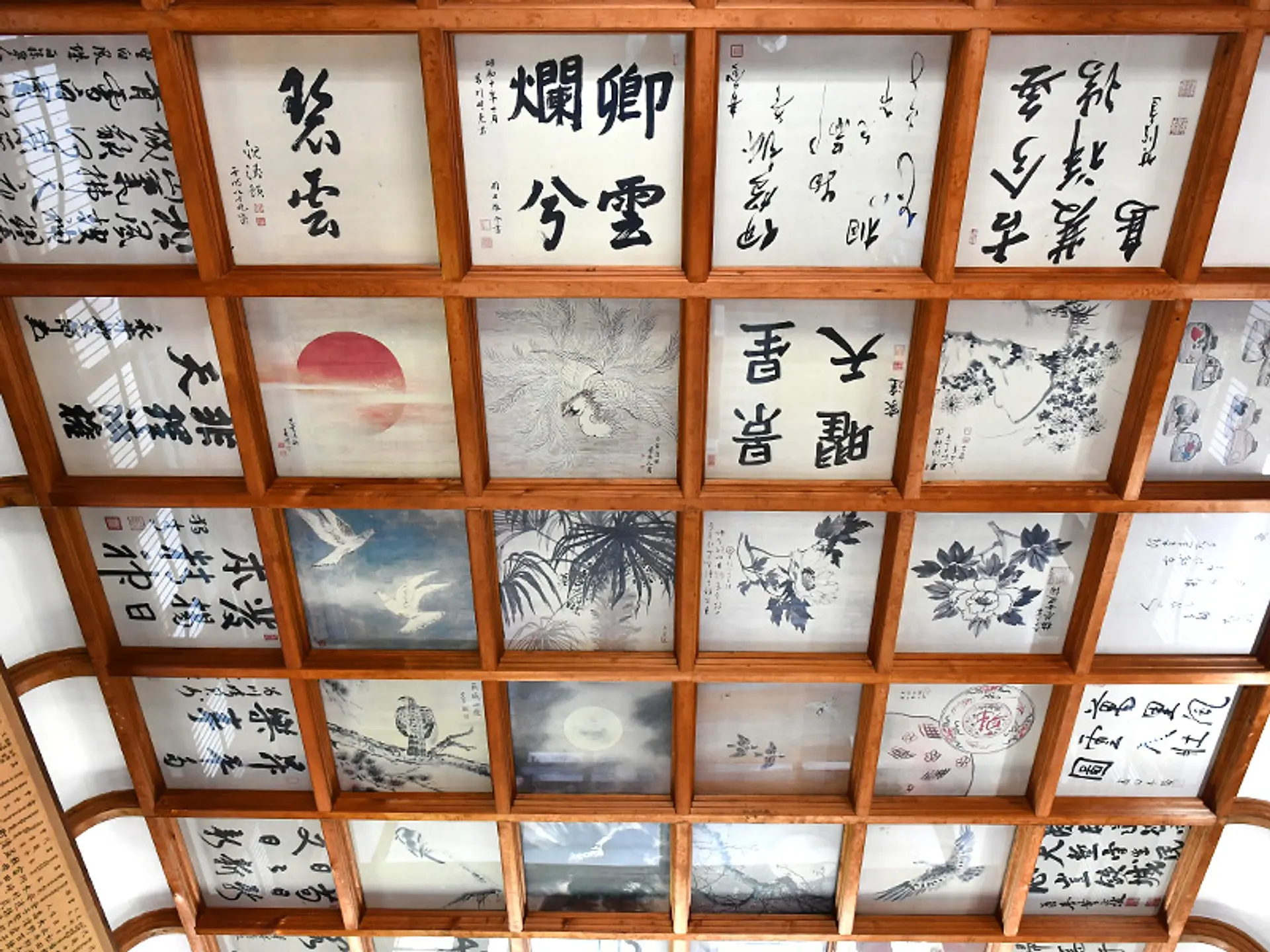 画家・横山大観の「満月」、そのとなりには私財を投じた川崎克(号・克堂)の鷹の絵をはじめ、政界人や文化人による46点もの色紙絵がはめ込まれています。
