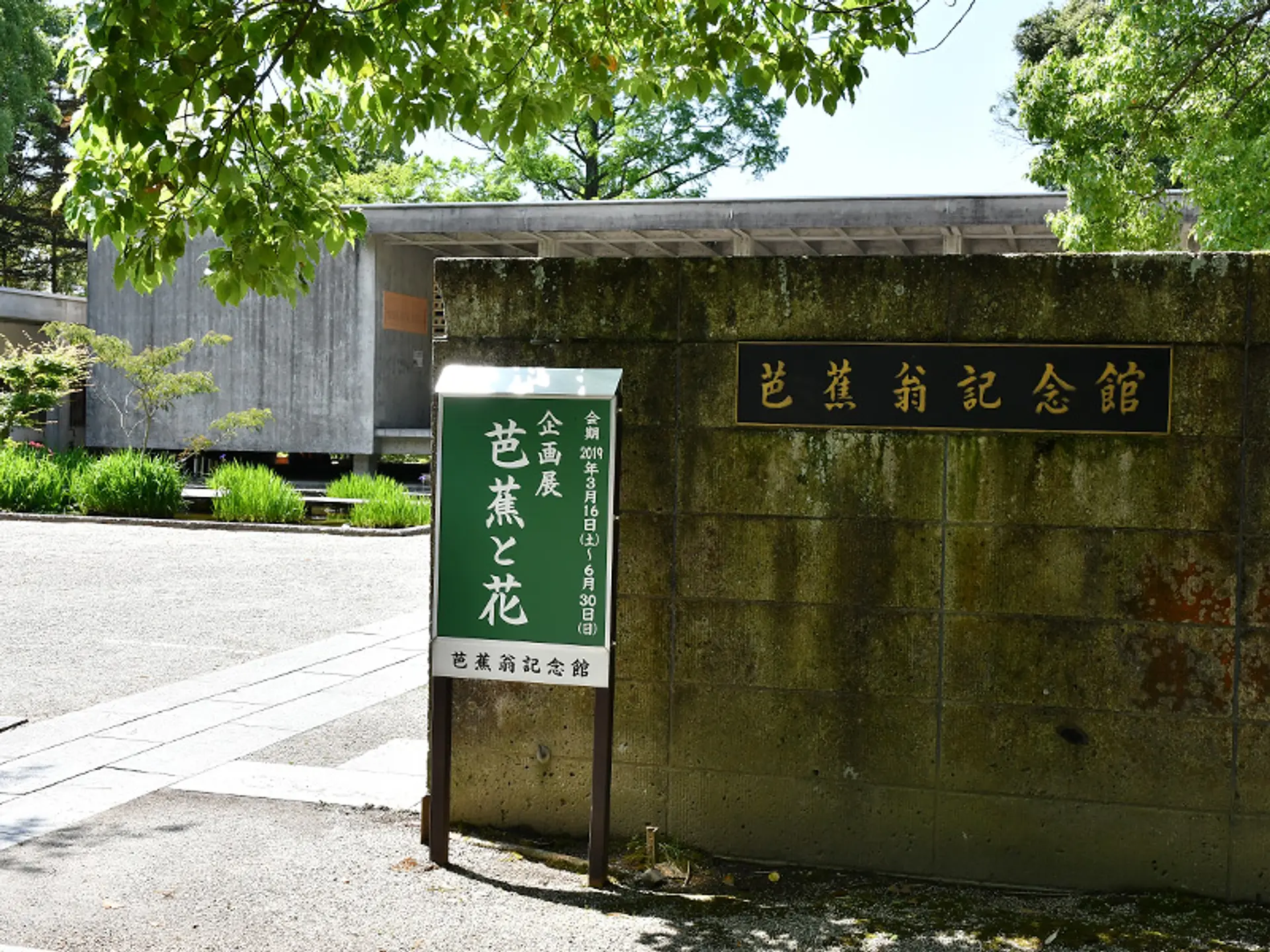松尾芭蕉の旅姿を模して造られているそうです。二層の丸い屋根は旅笠、俳聖殿の木額が顔、一層の八角形屋根は蓑や衣装、堂は脚部、回廊の柱は杖と足を表現しているとのこと。