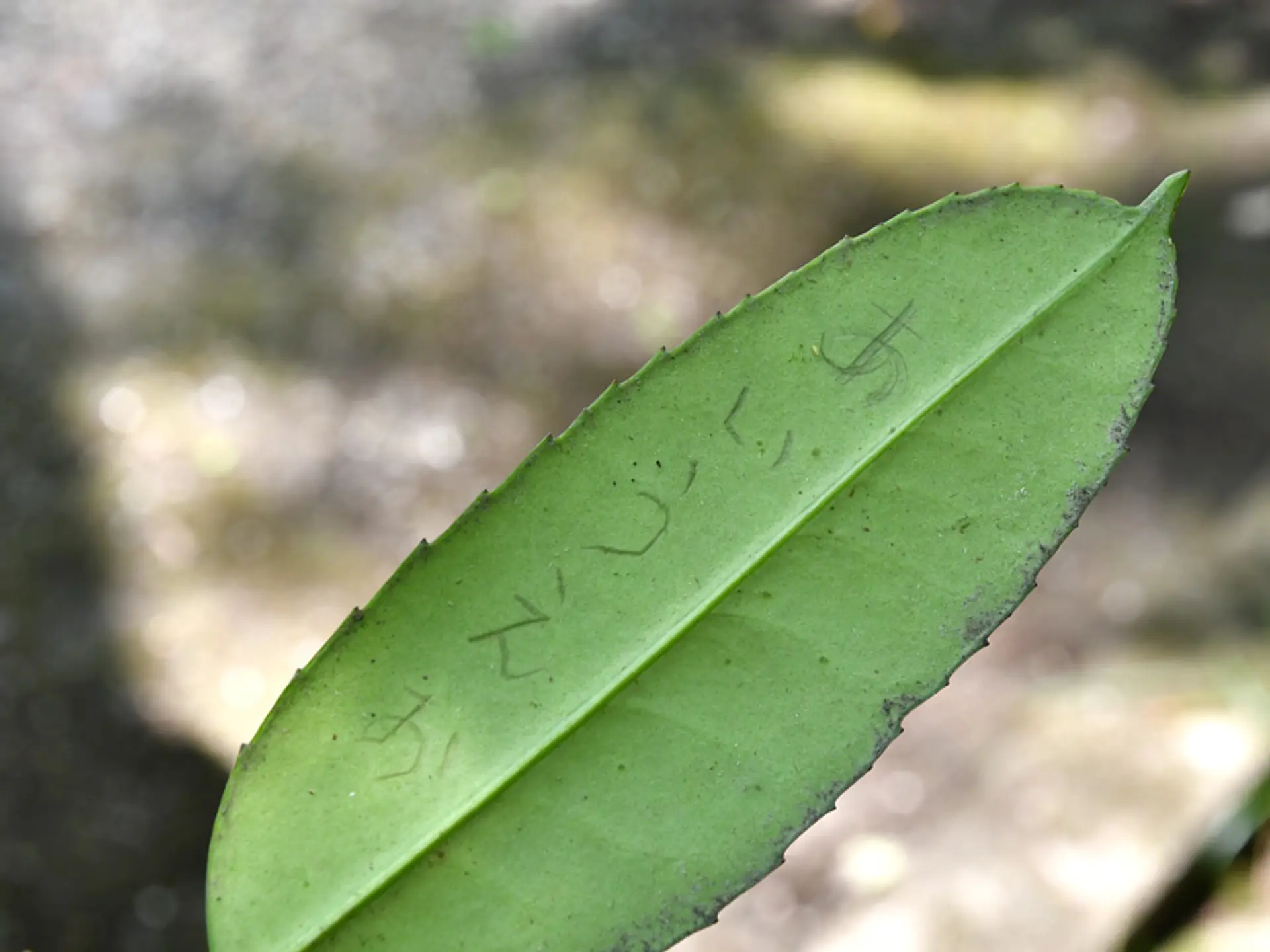 葉の裏に木の枝など少し硬いもので傷をつけると、跡が浮かび上がってきます。時間がたつほどに濃くなり、はっきりしてきます。
