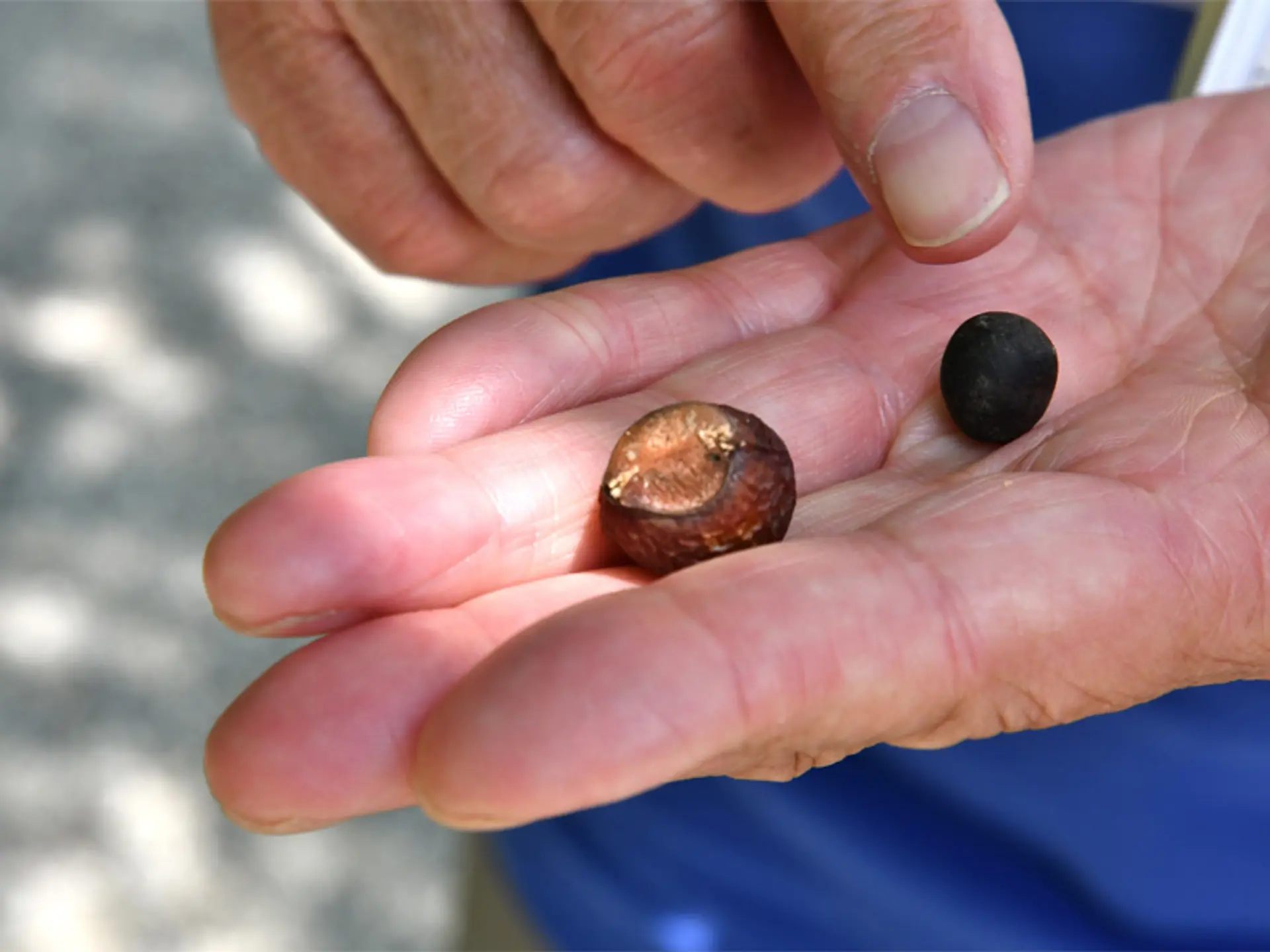 写真左側の外皮を向くと右側のような黒いものが出てきます。これが、羽子板の羽の黒い部分に使われます。