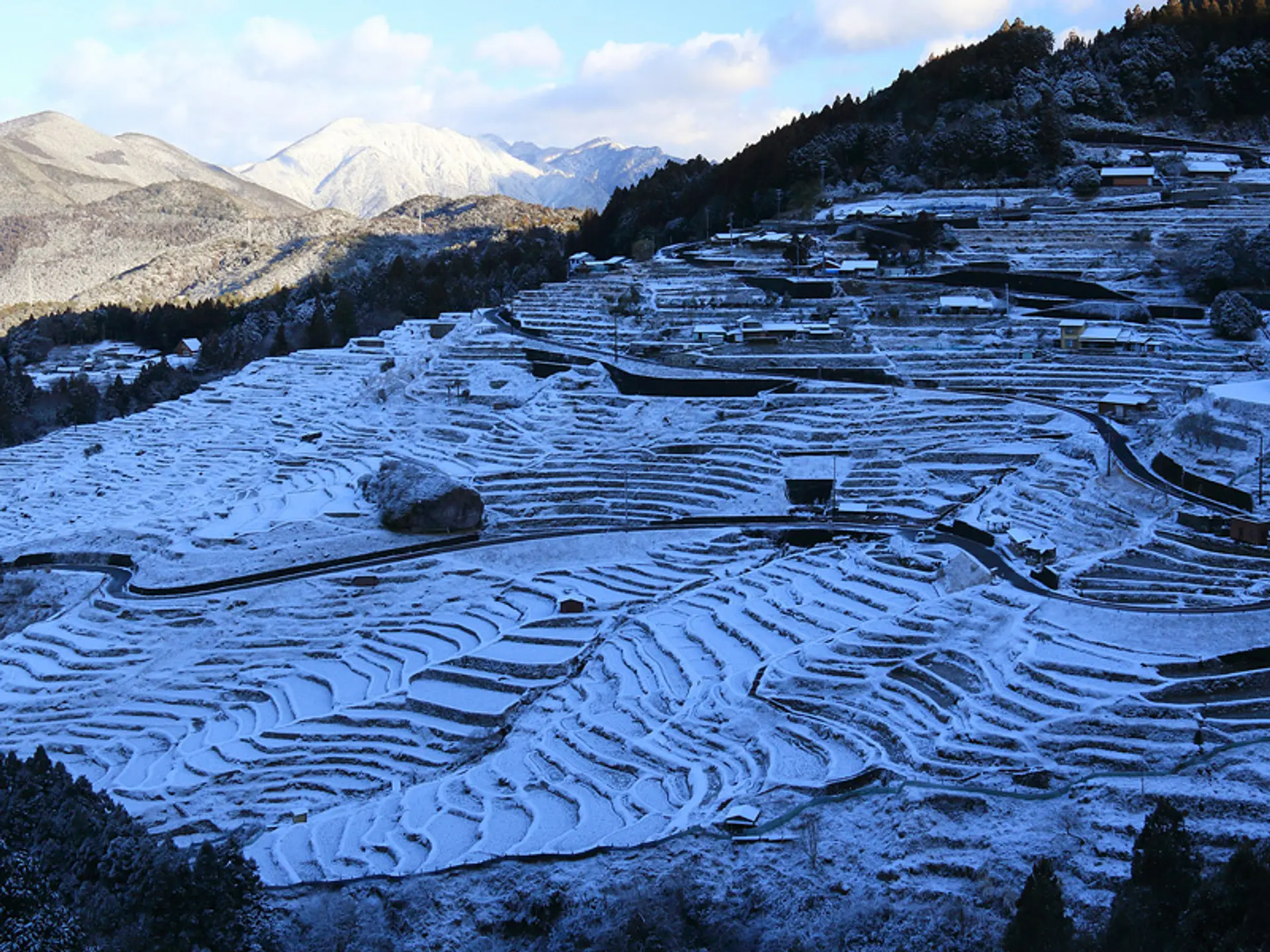 滅多にないのですが、雪が積もった真っ白な棚田を見ることが出来ることもあります。