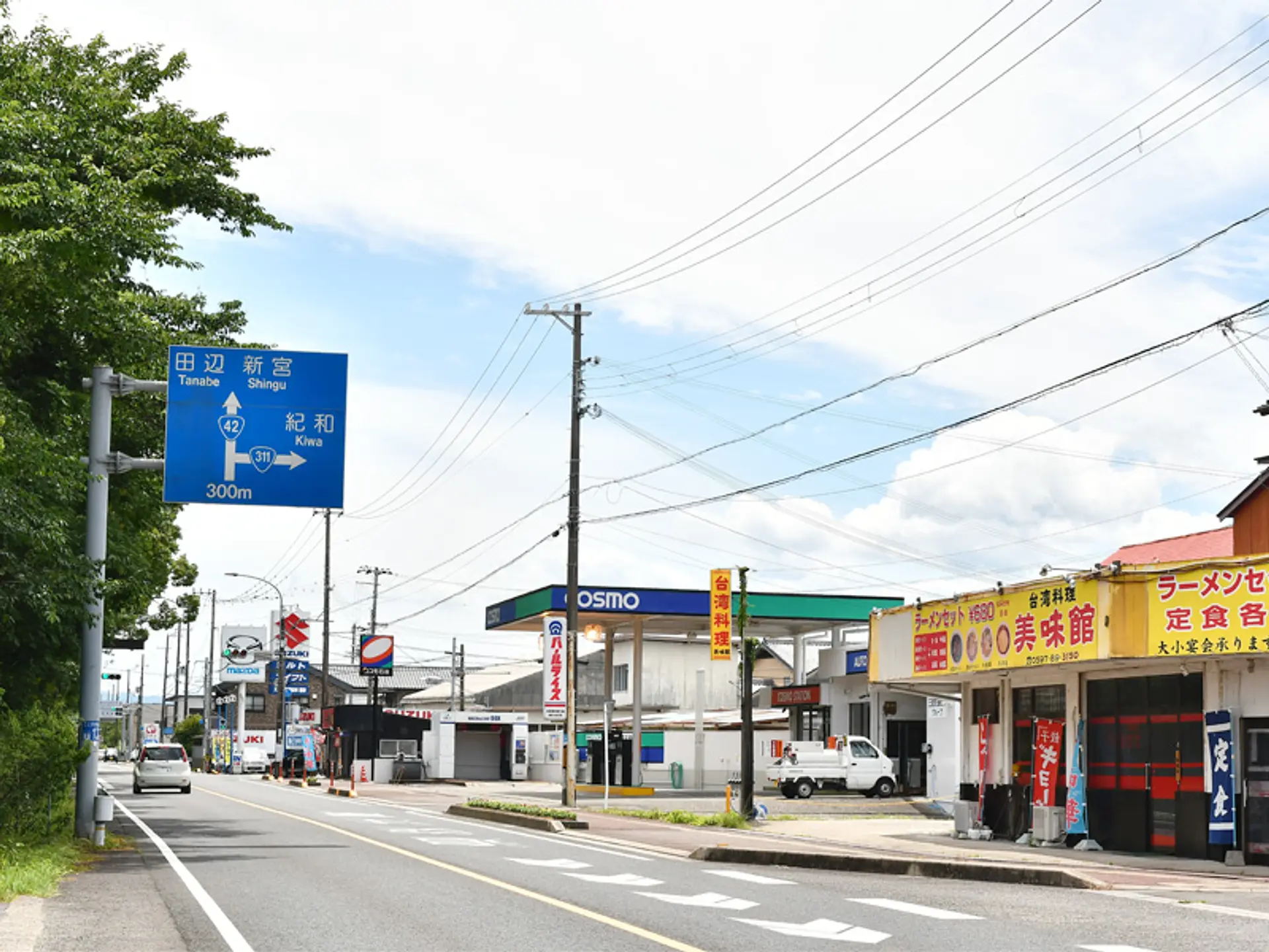 鬼ヶ城から国道42号線を車で走ること約10分、右手に黄色い看板の台湾料理のお店やコスモ石油が見えてきます。