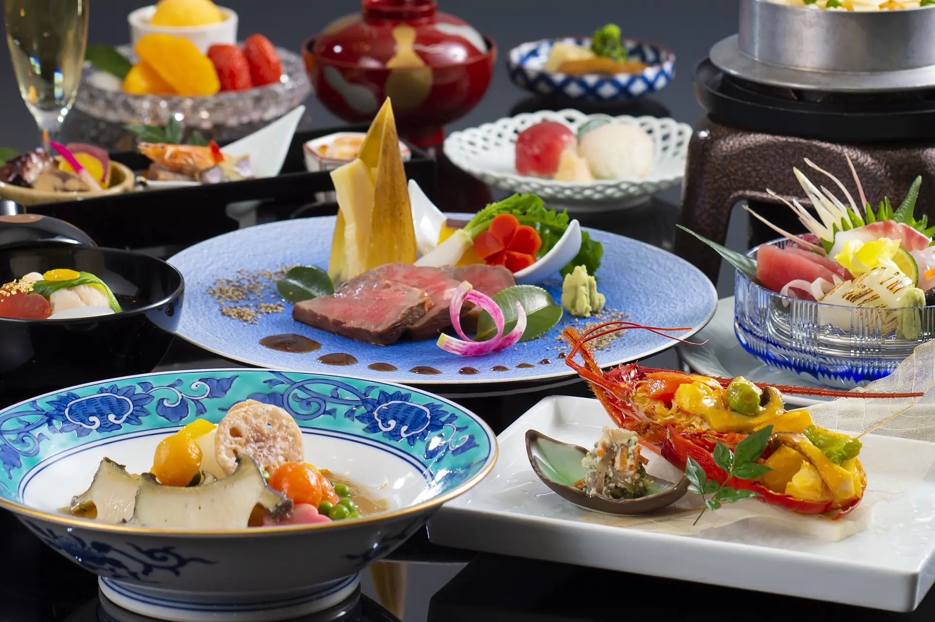 伊勢海老や鮑、松阪牛を贅沢に使った、スペシャルな夕食を堪能することができます。