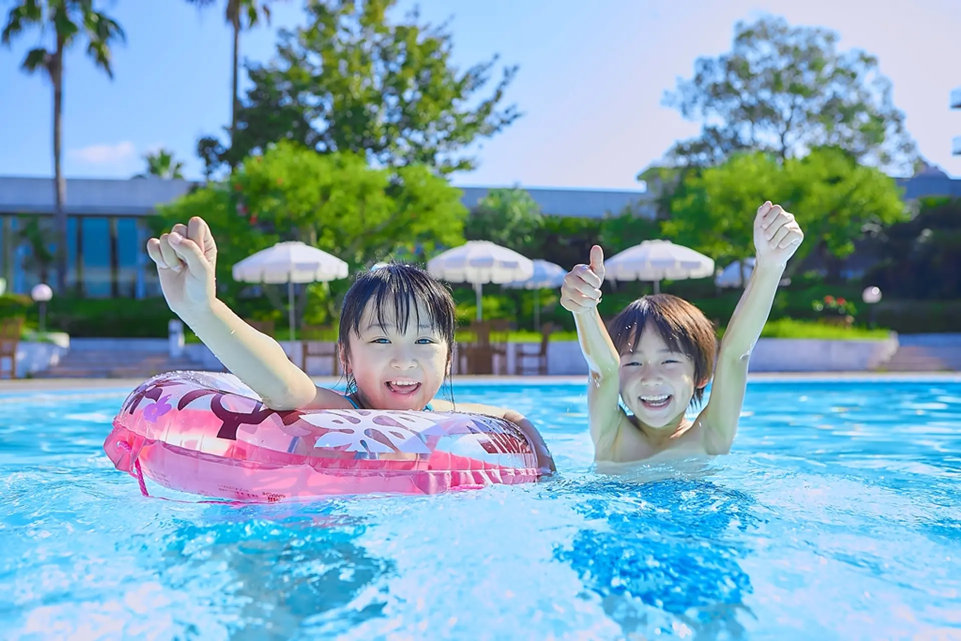ホテルのガーデンには夏季限定でプールもあり、たっぷりと遊ぶことができますよ!