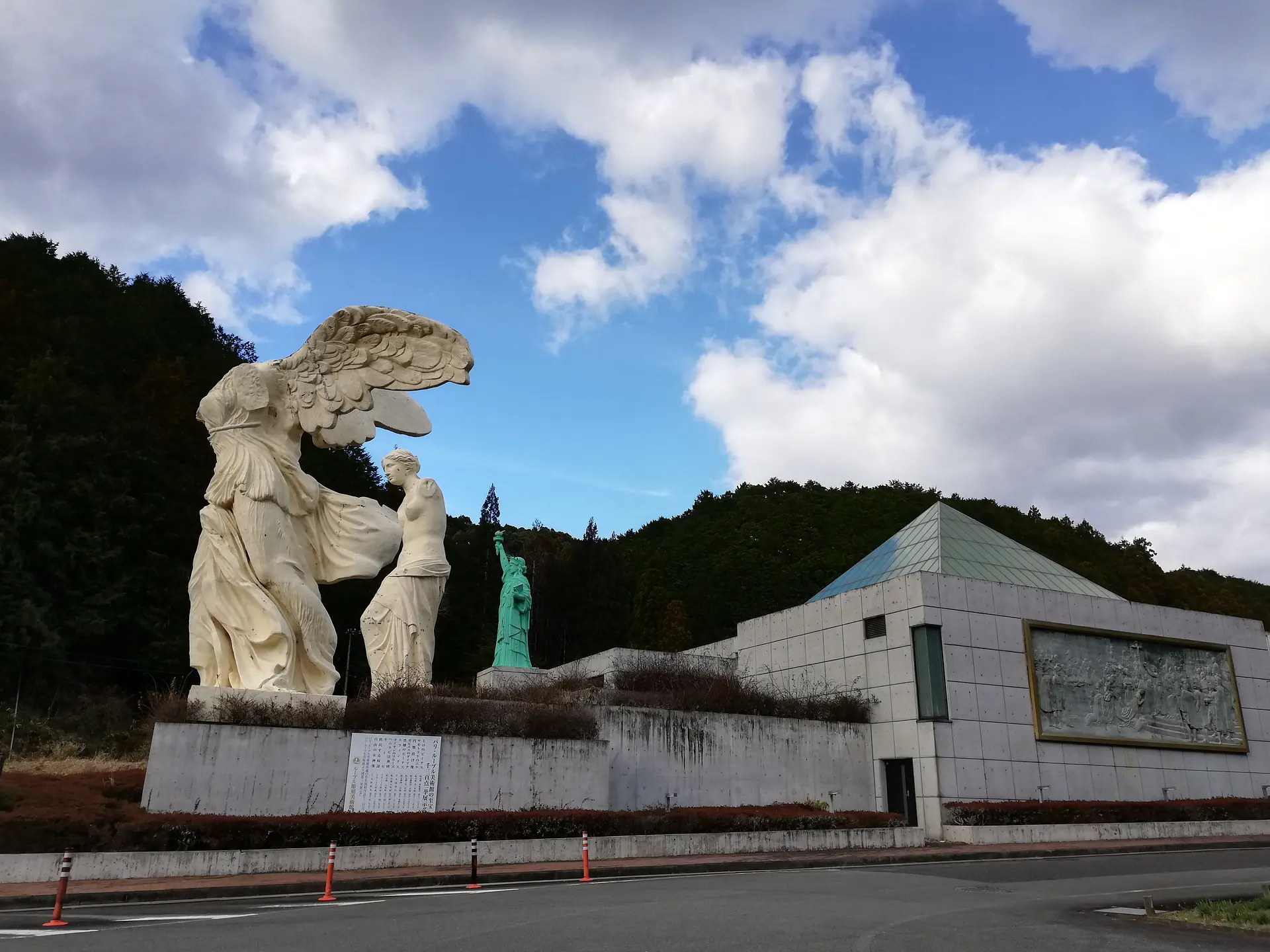 これらは、サモトラケのニケ、ミロのヴィーナス、自由の女神像を模した立像。三重県津市白山町の「ルーブル彫刻美術館」の屋外展示物なんです。