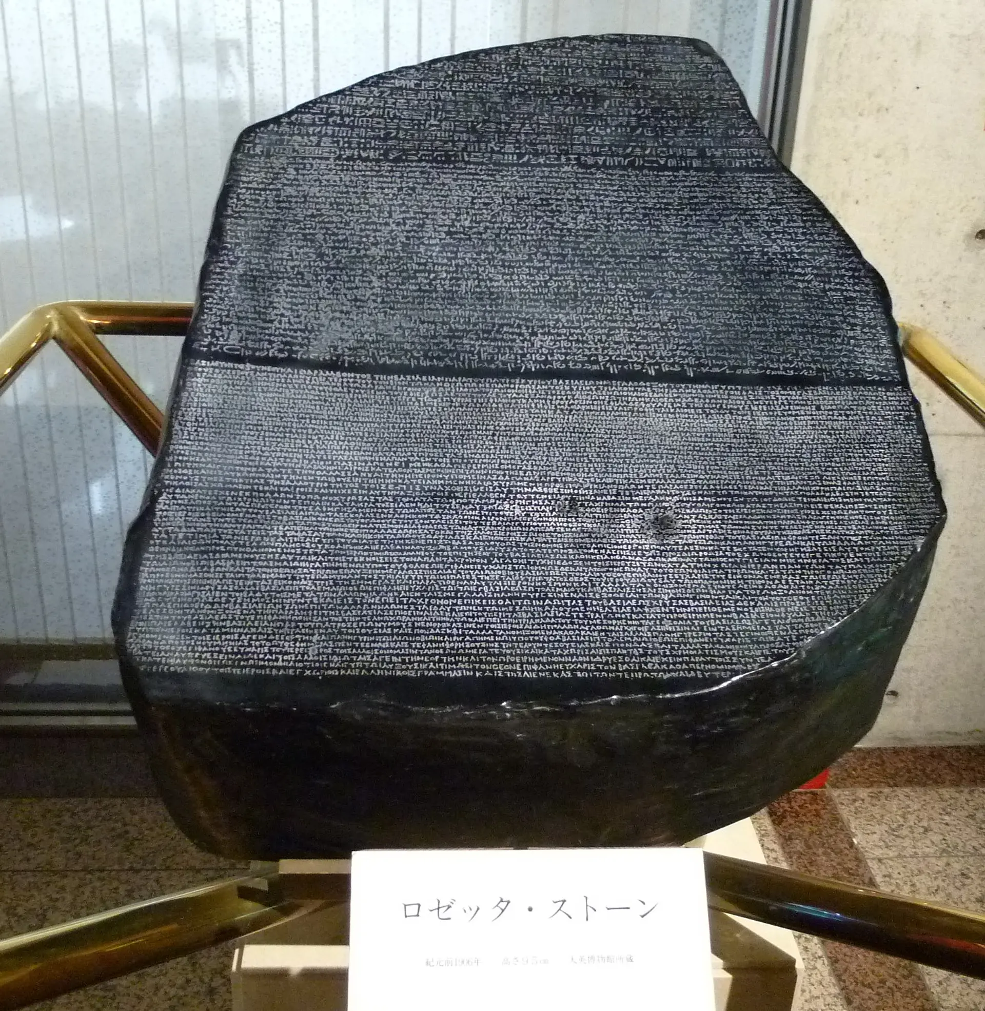 ロゼッタ・ストーンには上段のヒエログリフ(神聖文字)、中段のデモティック(民衆文字)、下段のギリシア文字の3種類の文字が刻まれており、それを本物さながらに再現。