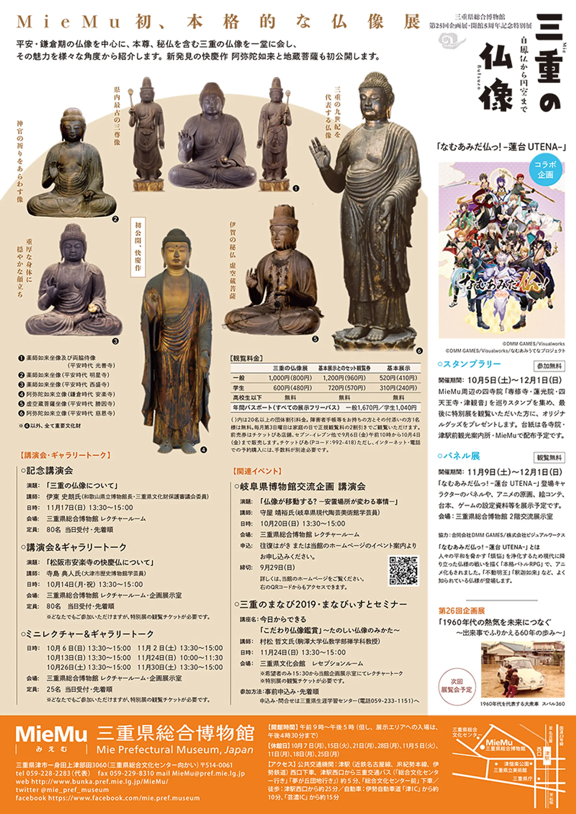 2019年12月1日(日)まで開催の、三重県総合博物館(MieMu)第25回企画展・開館5周年記念特別展「三重の仏像~白鳳仏から円空まで~」は、仏像をテーマにした展覧会で、平安・鎌倉期の仏像を中心に、本尊、秘仏を含む三重の仏像を一堂に会し、その魅力を様々な角度から紹介します。