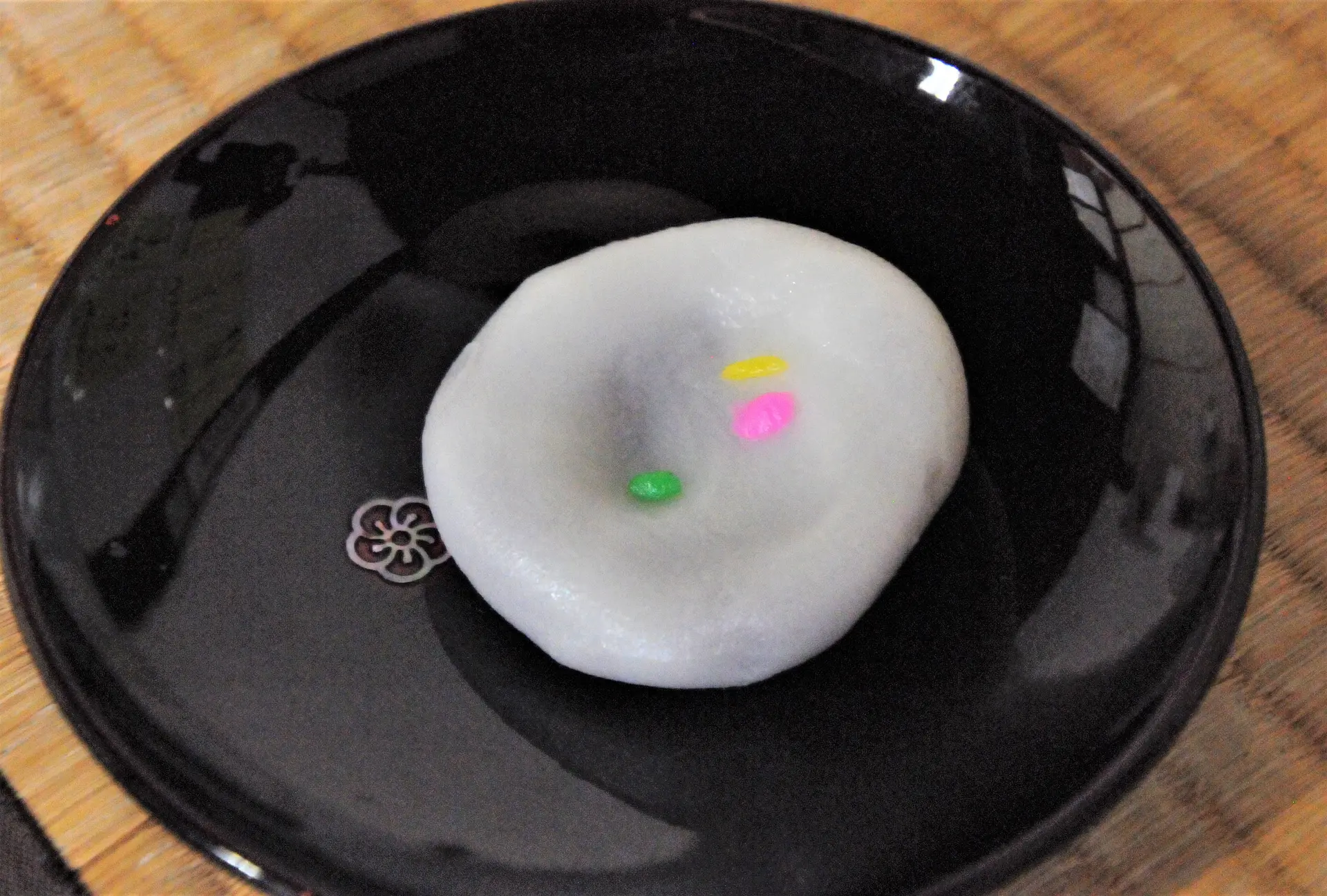 「三種の神器の勾玉をイメージしているといわれ、緑色の粒が春、赤色の粒が夏、黄色の粒が秋、もちの白が冬と四季を象徴しているんですよ」と前田屋製菓の前田美那子さんが教えてくださいました。