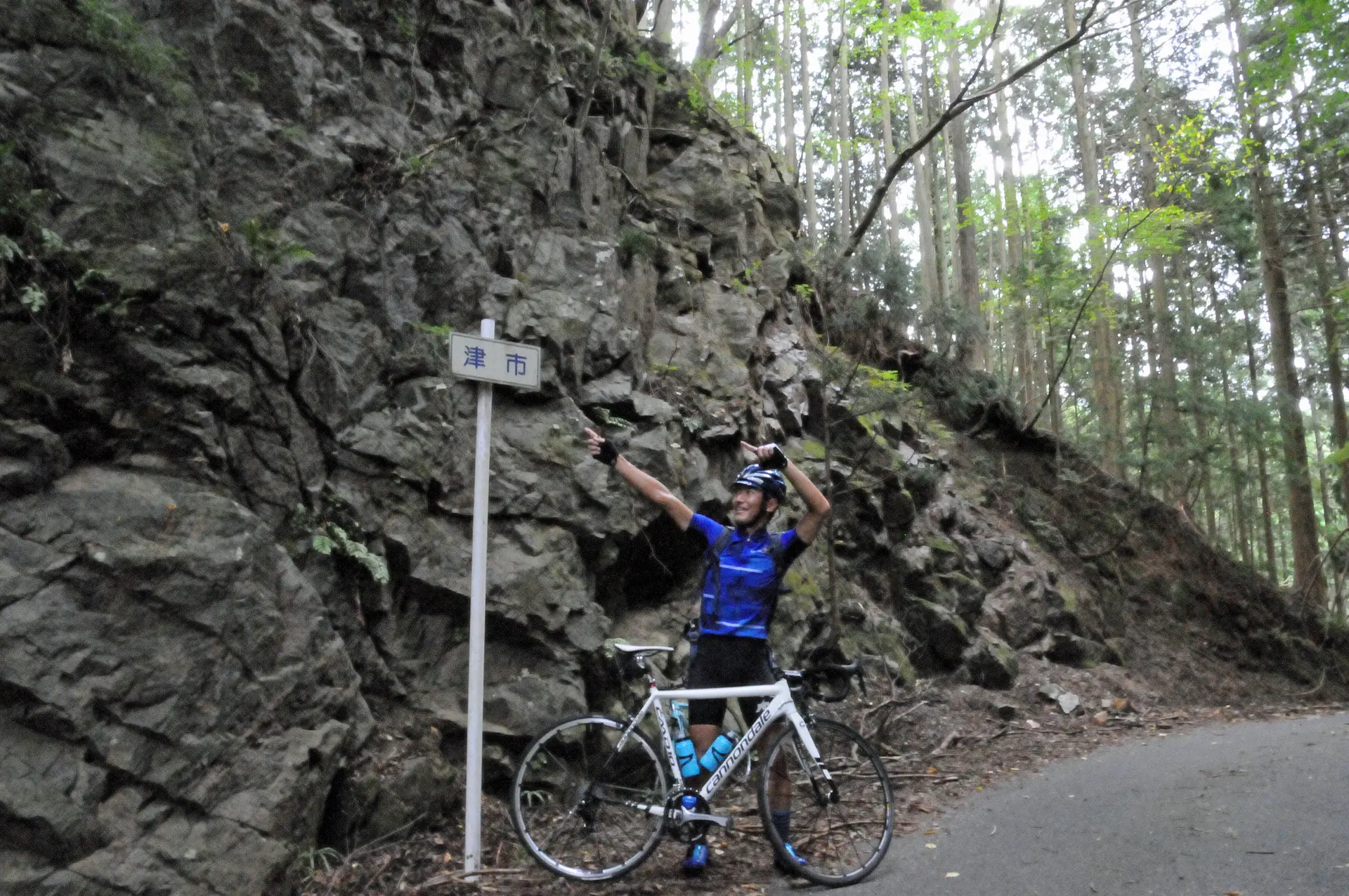 上りきった記念に亀山市と津市の市境の標識のあるところで記念撮影。あとは安濃ダム方面まで下りのみですが、路面が荒れているので慎重に下りましょう。