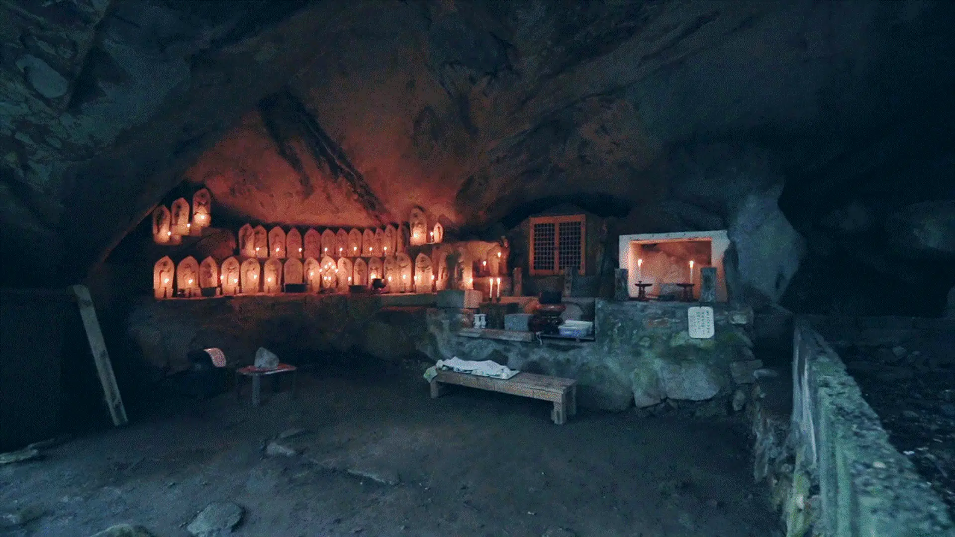 岩屋堂に到着すると本尊の聖観音石像と33体の観音石仏がたたずむ霊場が広がり、灯したロウソクの灯りは神秘的でゆっくりと時間が過ぎていきます。心も洗浄されているような気持ちになります。