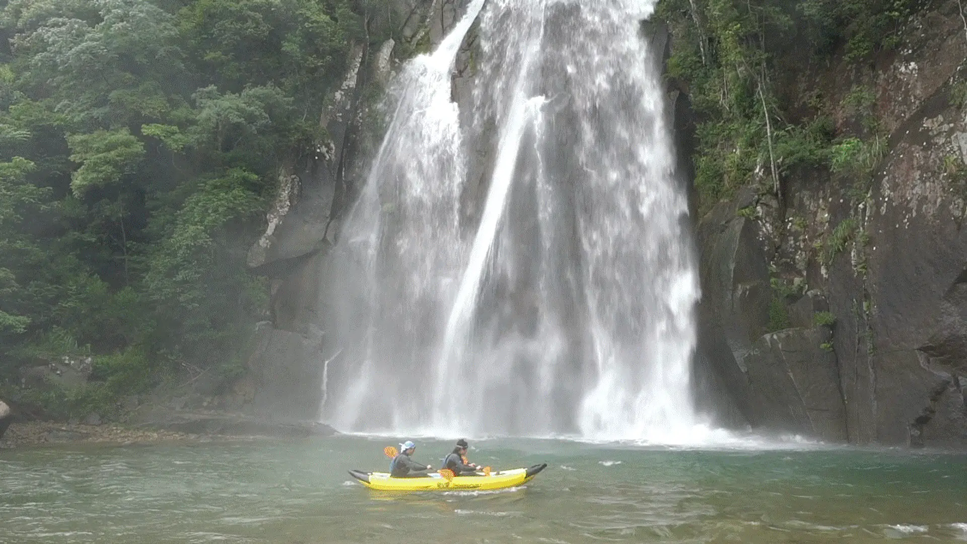 ダッキーというゴム製のカヌーに乗って滝壺で遊べます。滝に突入すると30mの高さから打ちつける水にはびっくり!