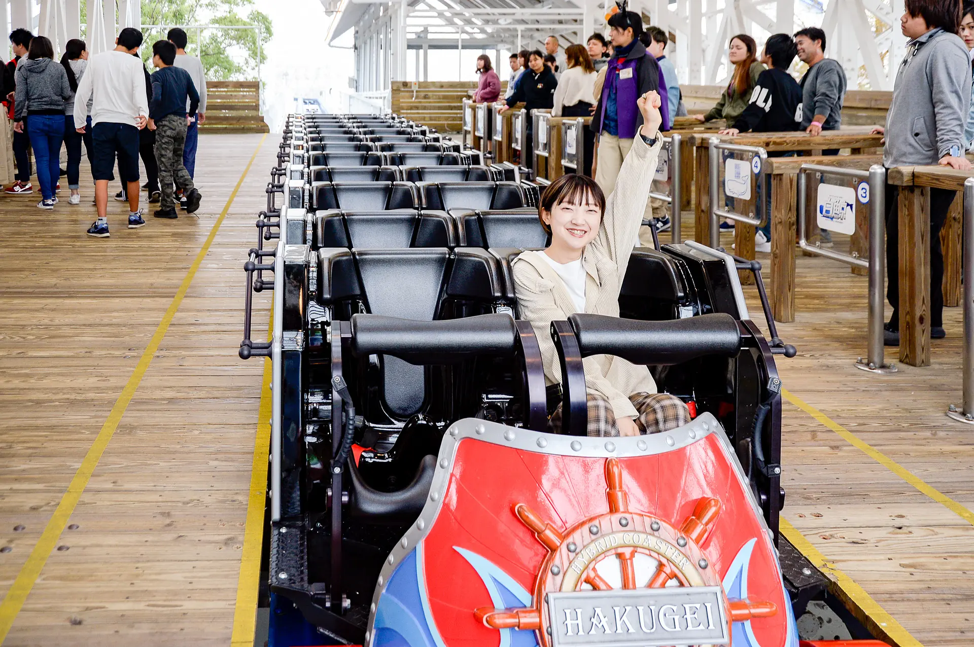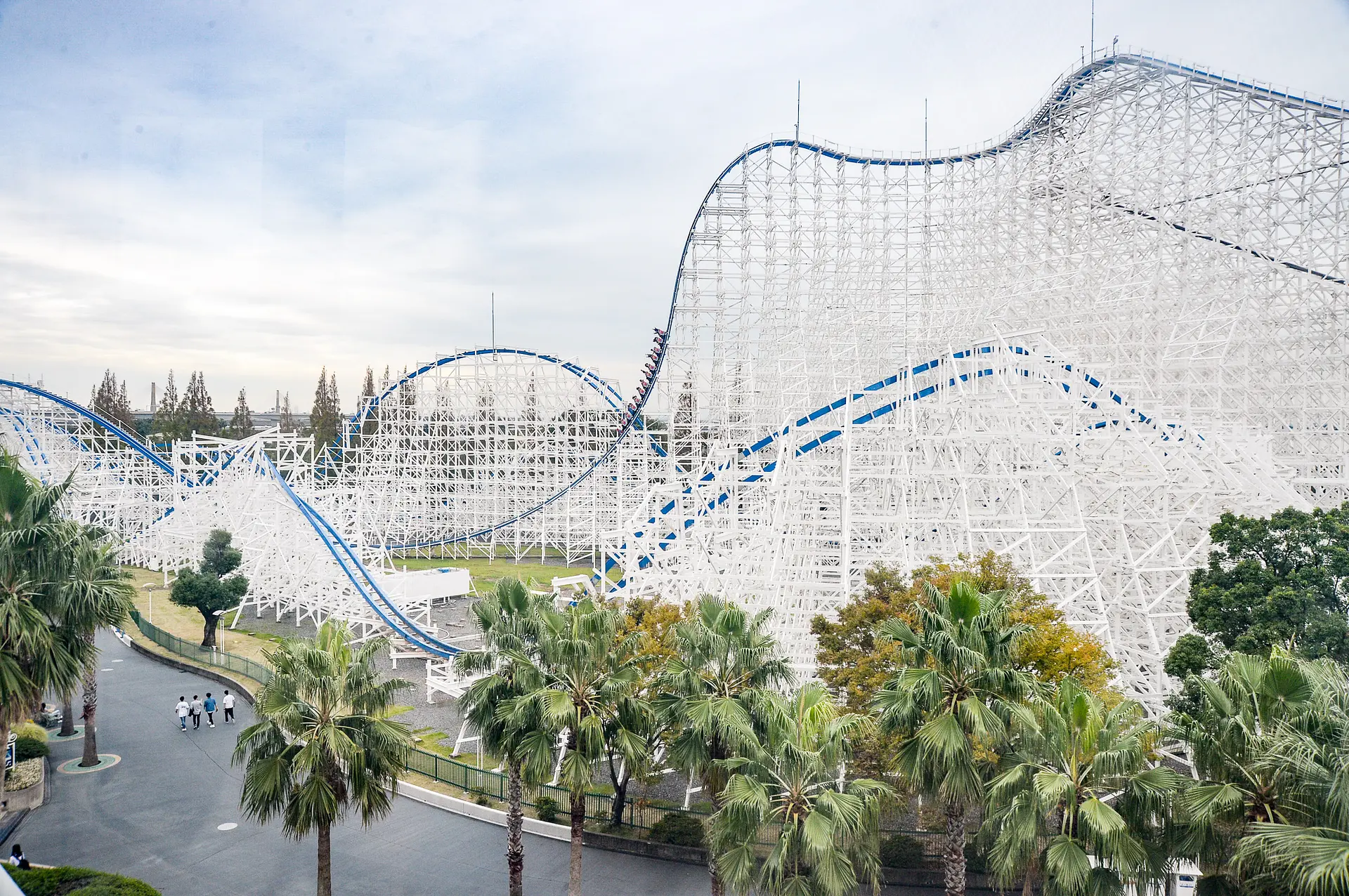 こちらは木材と鋼鉄を融合した日本初・アジア初のハイブリッドコースター!美しい真っ白な木製の柱に囲まれたコースを、爽快かつスリリングに駆け抜けて行きます。