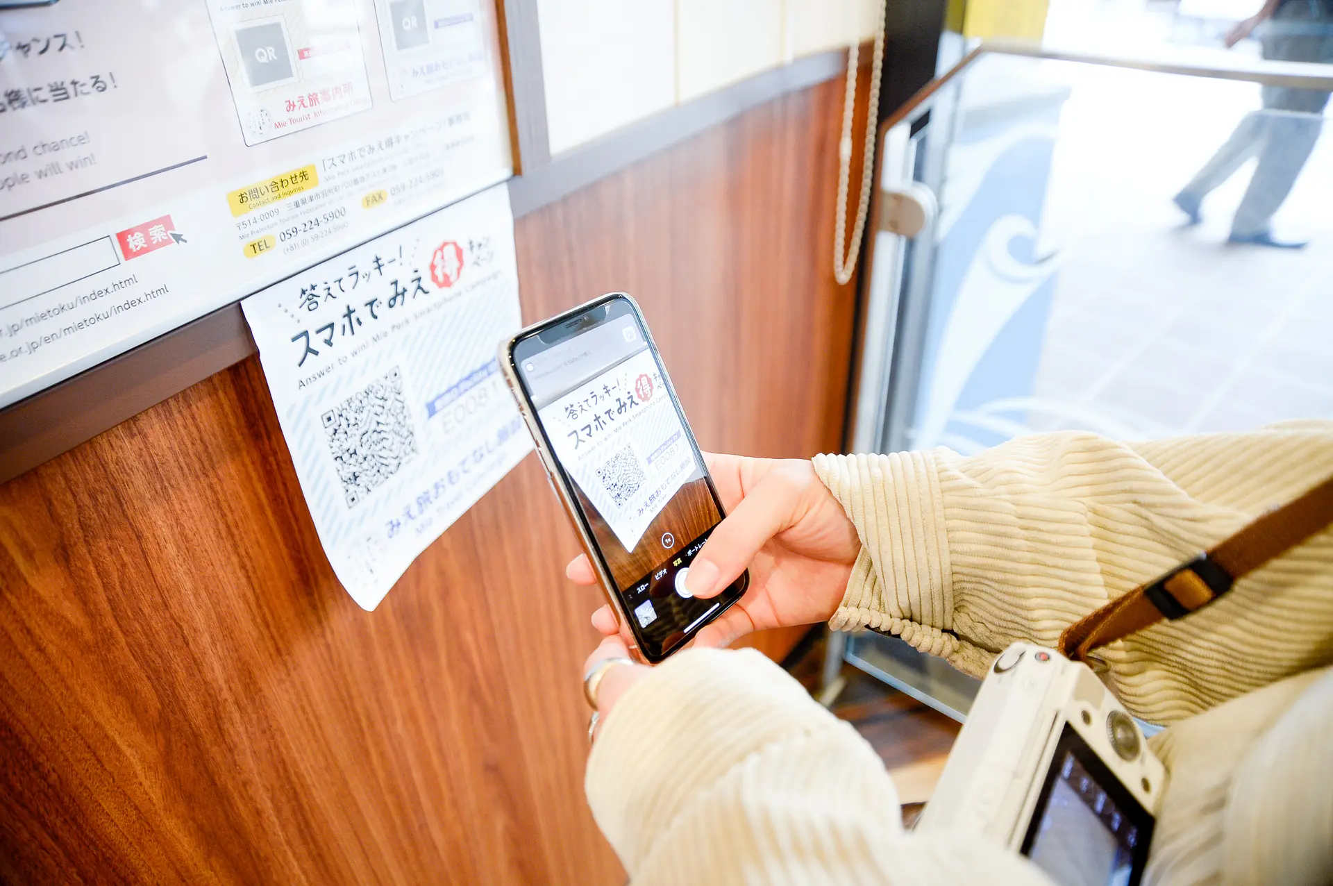入場ゲートから入ってすぐ、向かって右の総合案内所に「みえ旅おもてなし施設」表示ステッカーに記載してあるQRコードがあり、QRコードを読み込んで簡単なアンケートに答えると、オリジナル壁紙をダウンロードすることができます。