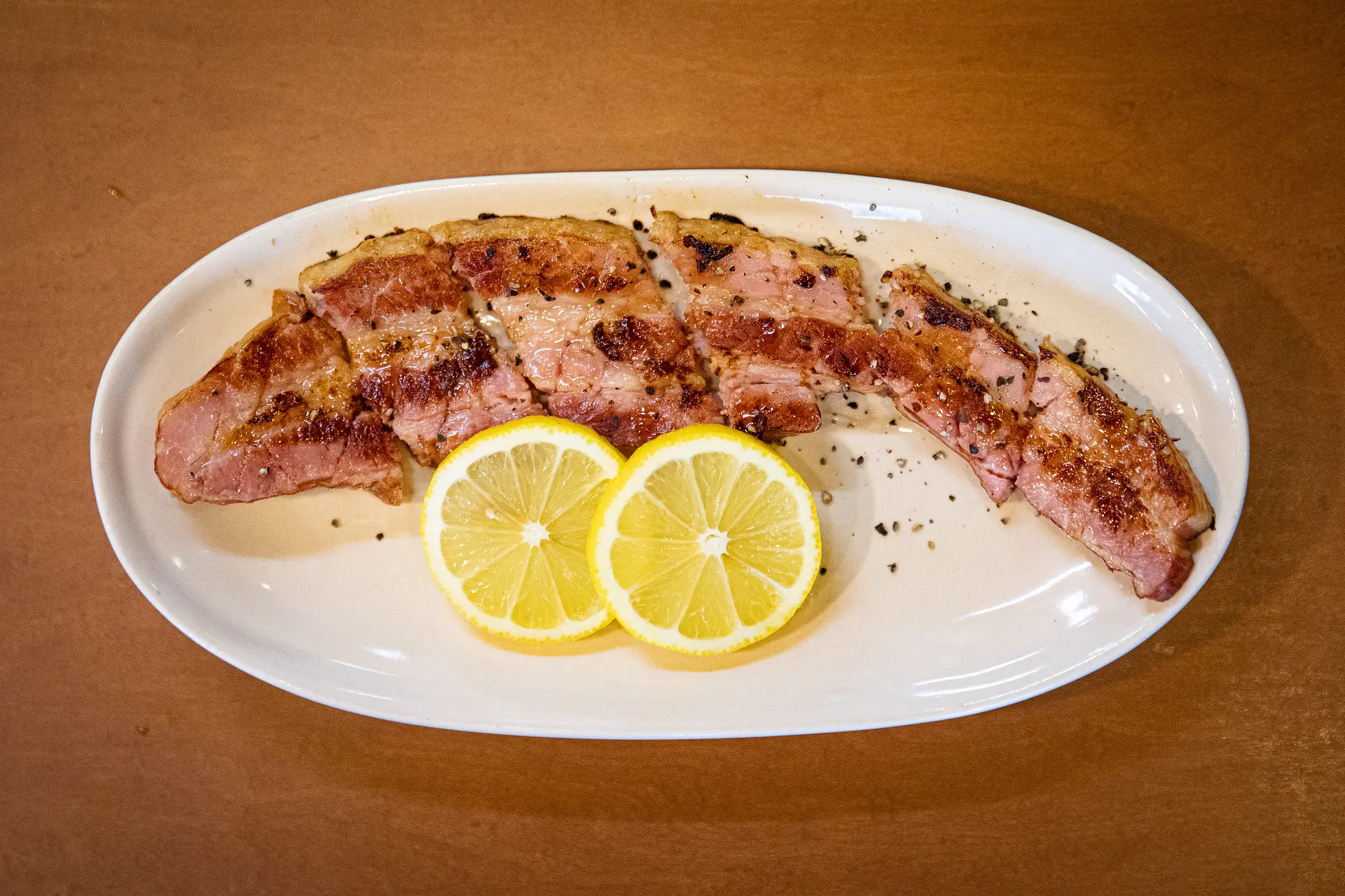 まずは厚切りベーコン(850円/税抜)。コショウのみというシンプルな味付けと思いきや、ほのかな甘み…。何とハチミツがかけてあるとか。塩気が強くなり過ぎないようバランスを取るためだそうです。