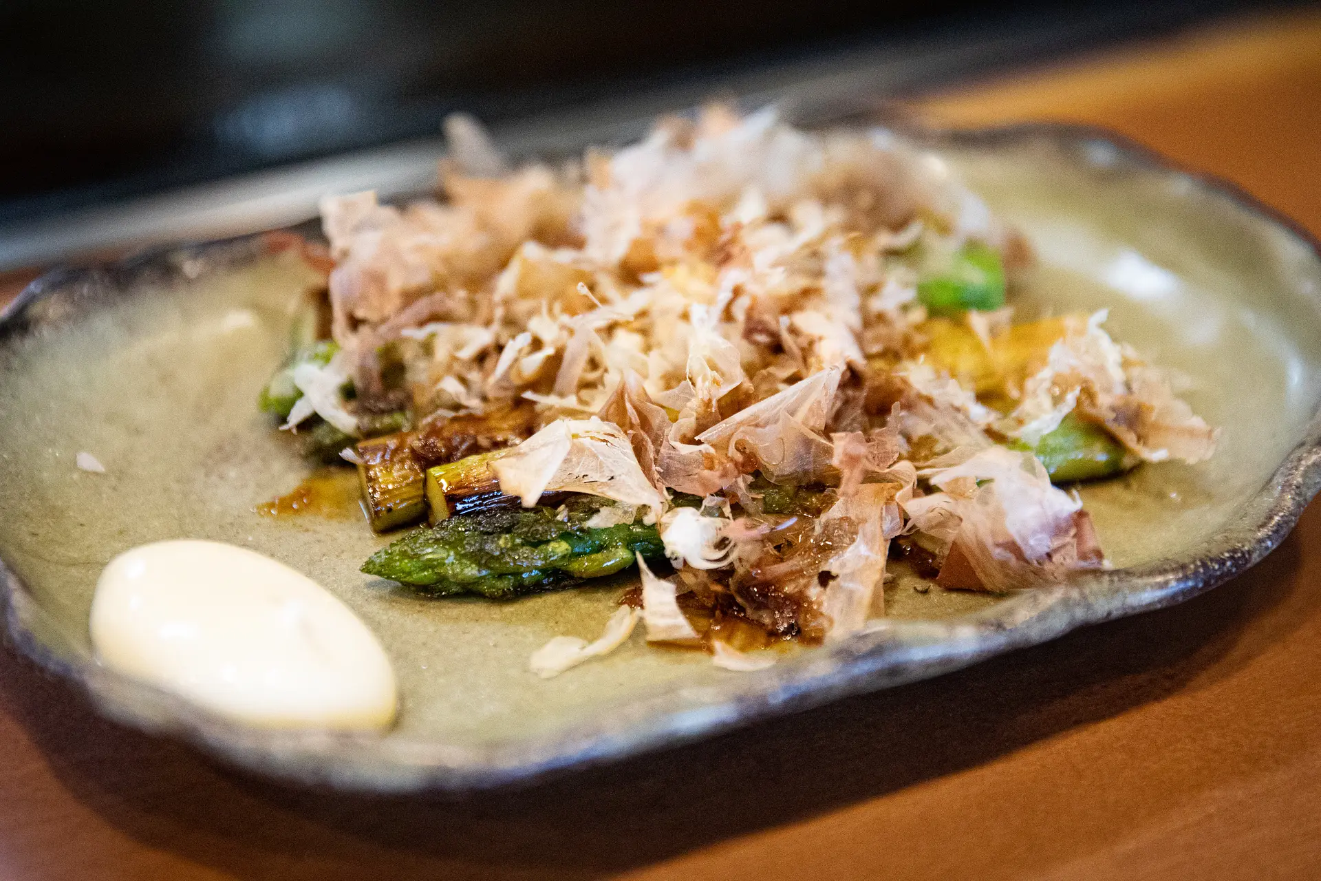 アスパラ焼(570円/税別)。野菜類はこのほかにも、なすび焼、きのこ炒め、しいたけ焼、スライストマト、もやし炒めなど豊富なラインナップ。