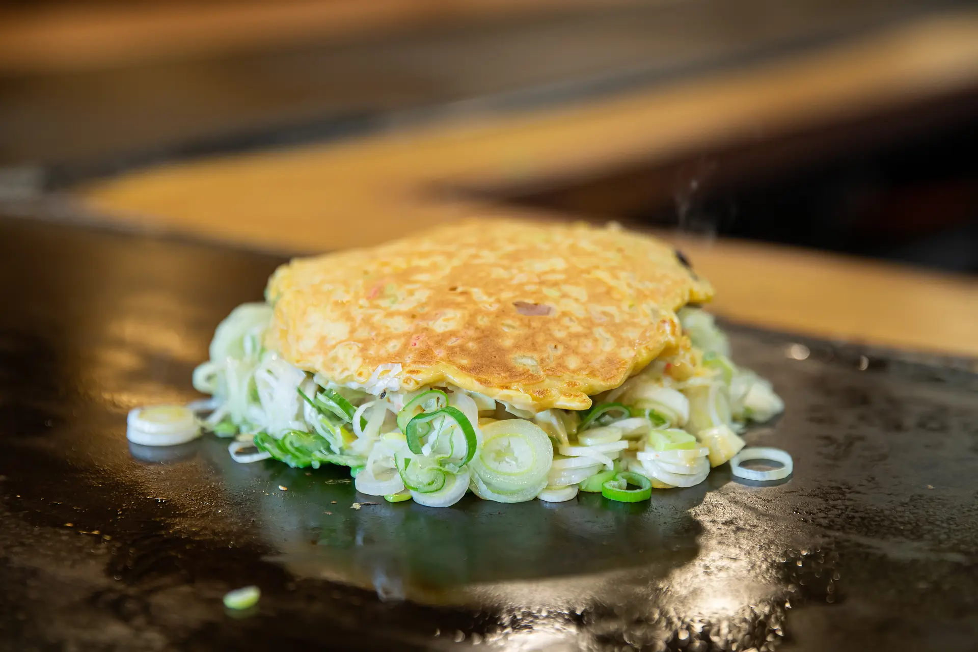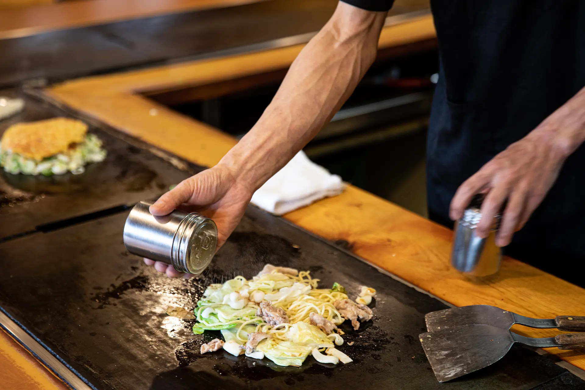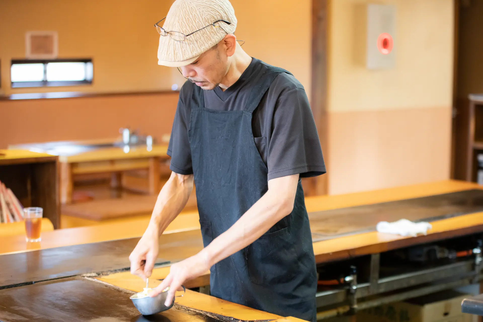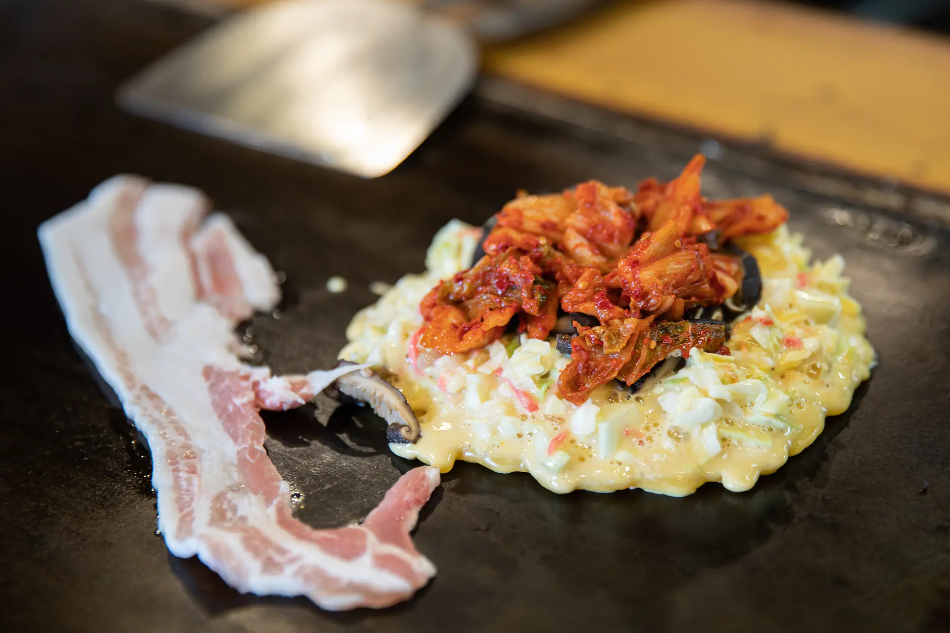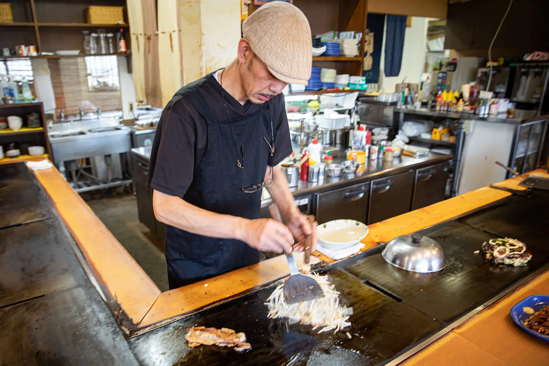 店長との話がはずむ中、お好み焼きの素材が慣れた手付きで鉄板の上に広げられます。