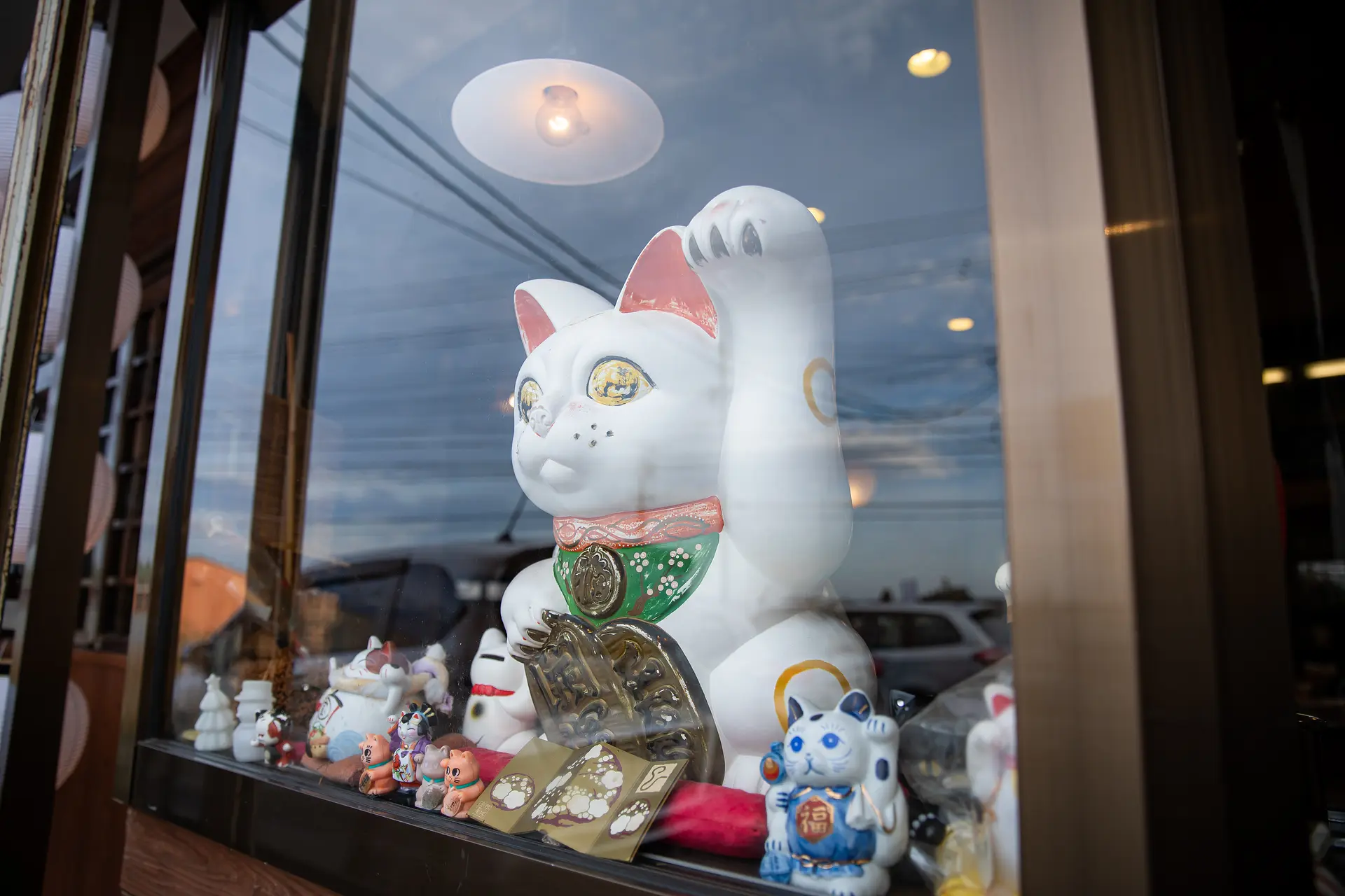 お店に入る際に目に留まる招き猫。オープン以来、ずっと飾られているシンボル的な存在です。