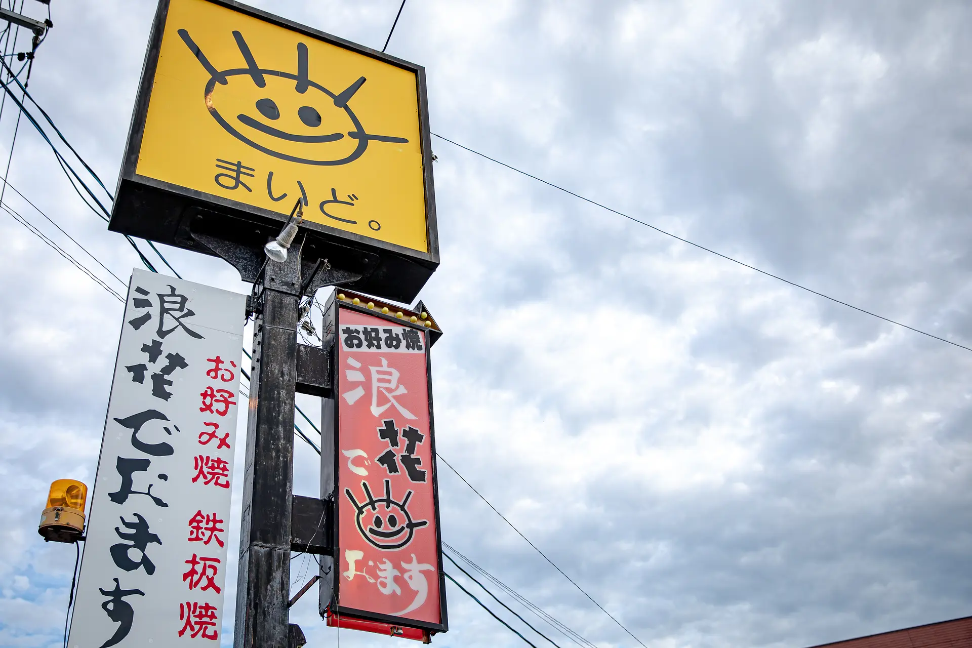 国道23号線から通称「鈴鹿サーキット道路」に入り、車で3分ほど走ると大阪弁の「まいど」と書かれた黄色い看板が見えてきます。