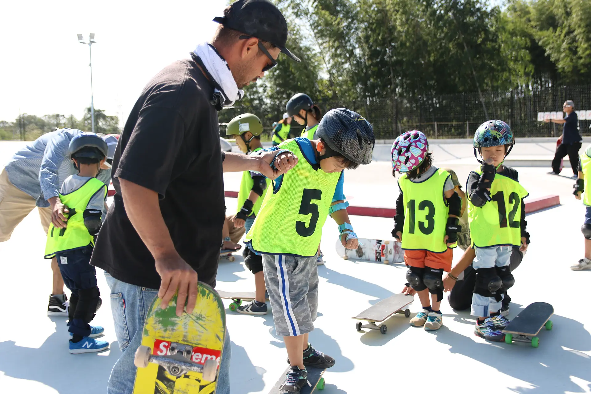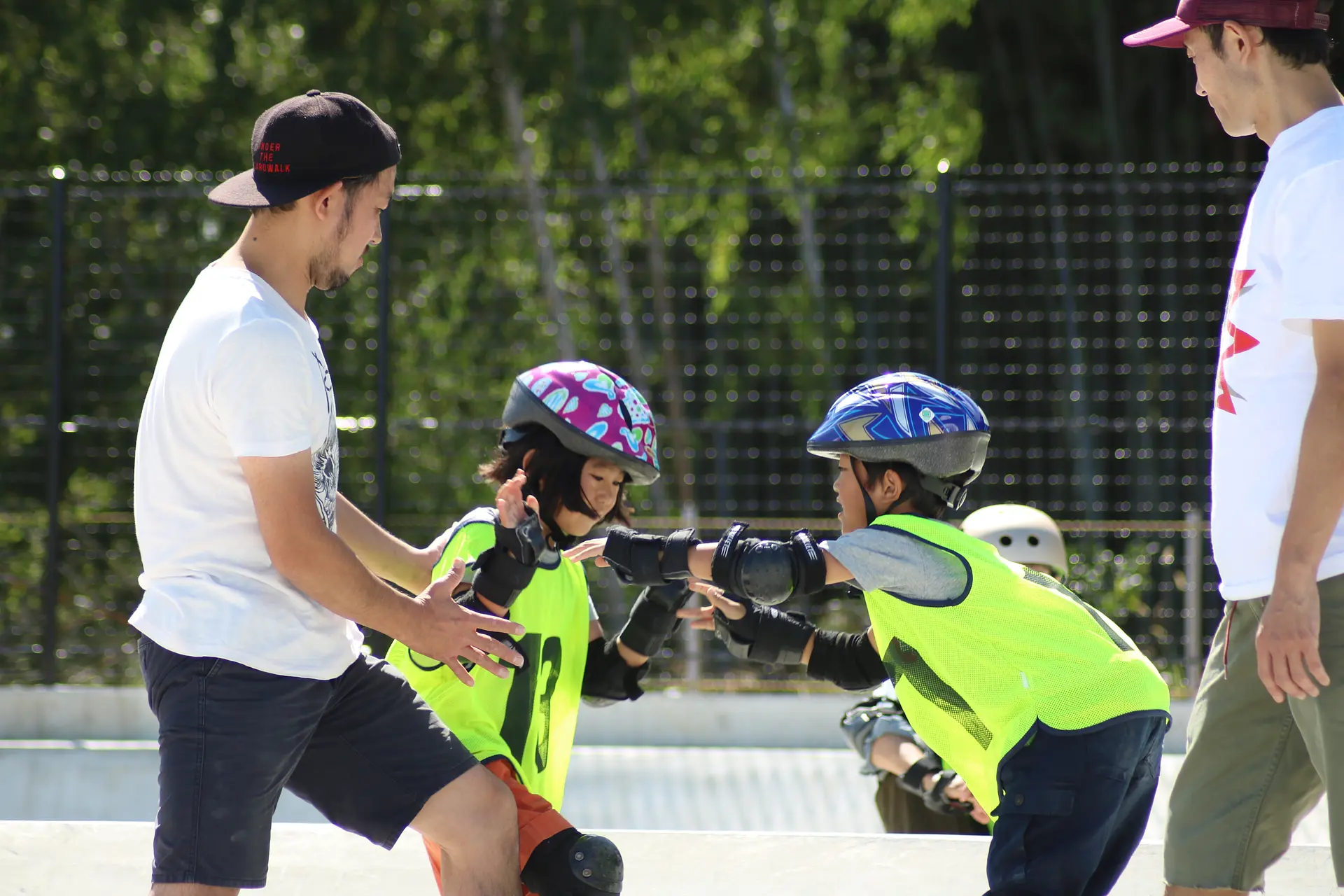 講師の先生がしっかりと手を握り、はじめて乗るスケートボードにドキドキ。保護者の方も近くで見学することもできます。