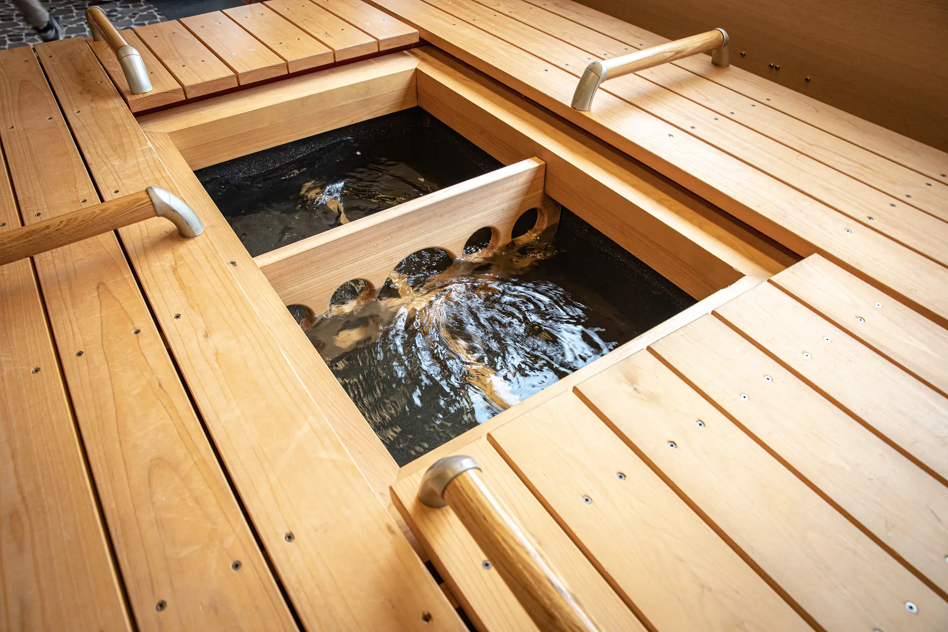 注がれている足湯は、列車の運行当日に菰野町の職員が、菰野温泉の源泉から汲んでいるとのこと。足湯キット1台につき120リットルもの温泉が使用されています。また、循環ろ過装置も備えられているので衛生面でも安心です。