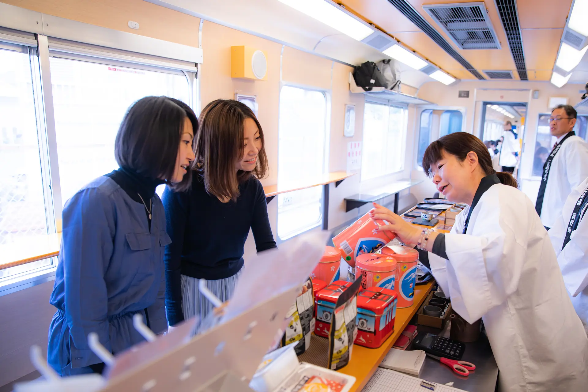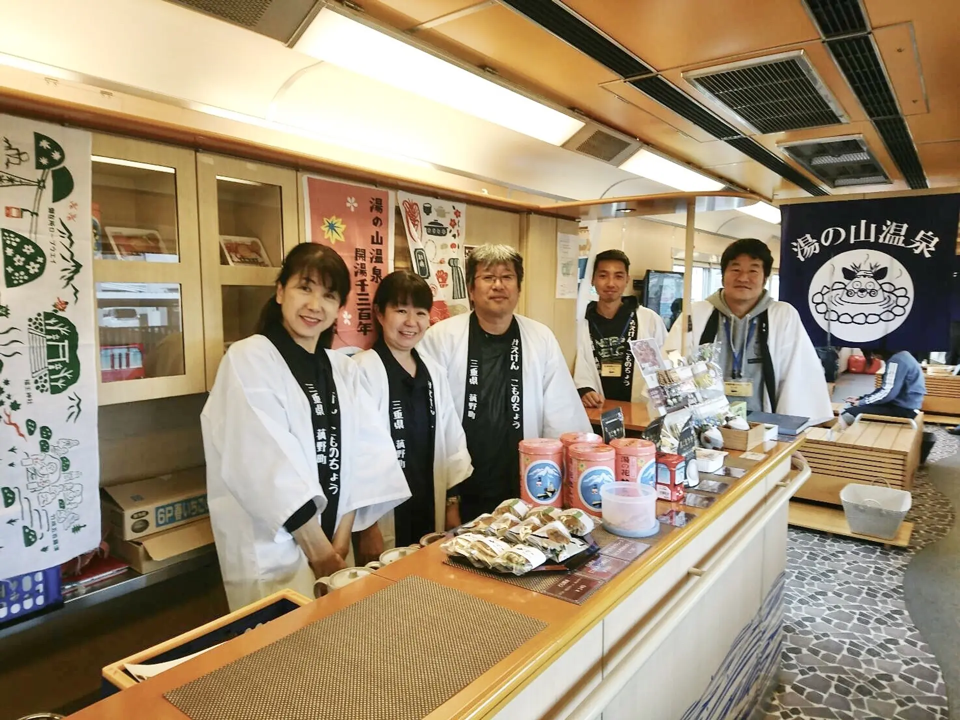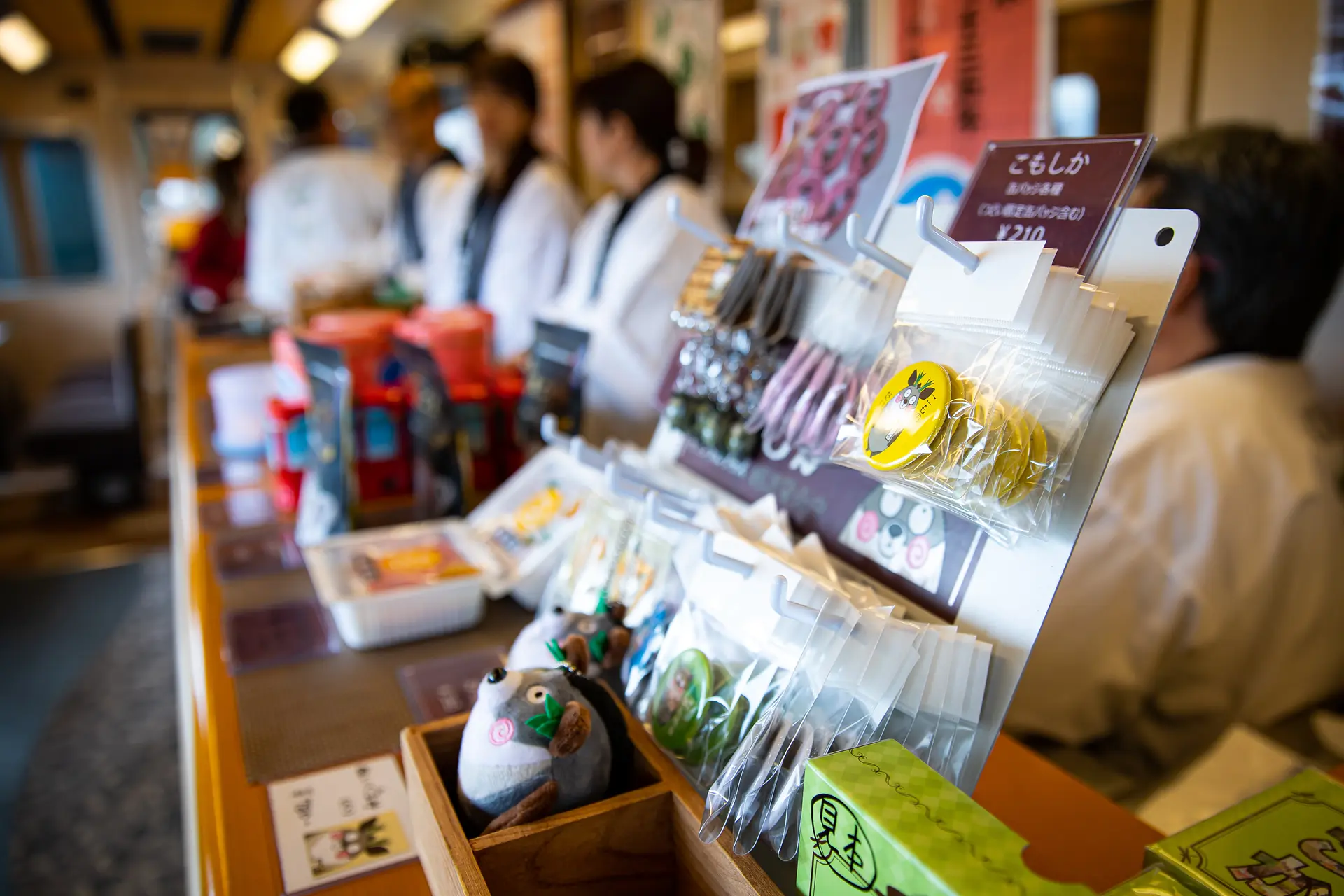 2号車のバーカウンターには、一番人気の「湯の花せんべい」をはじめ、菰野町産まこも若葉粉末を生地に練り込んだ「どら焼き」、豆腐の入れ物に入った手ぬぐい「木綿湯布」など、菰野町ならではの特産品が取り揃えられています。乗車した記念にと、お財布のヒモも思わず緩んでしまいそう。