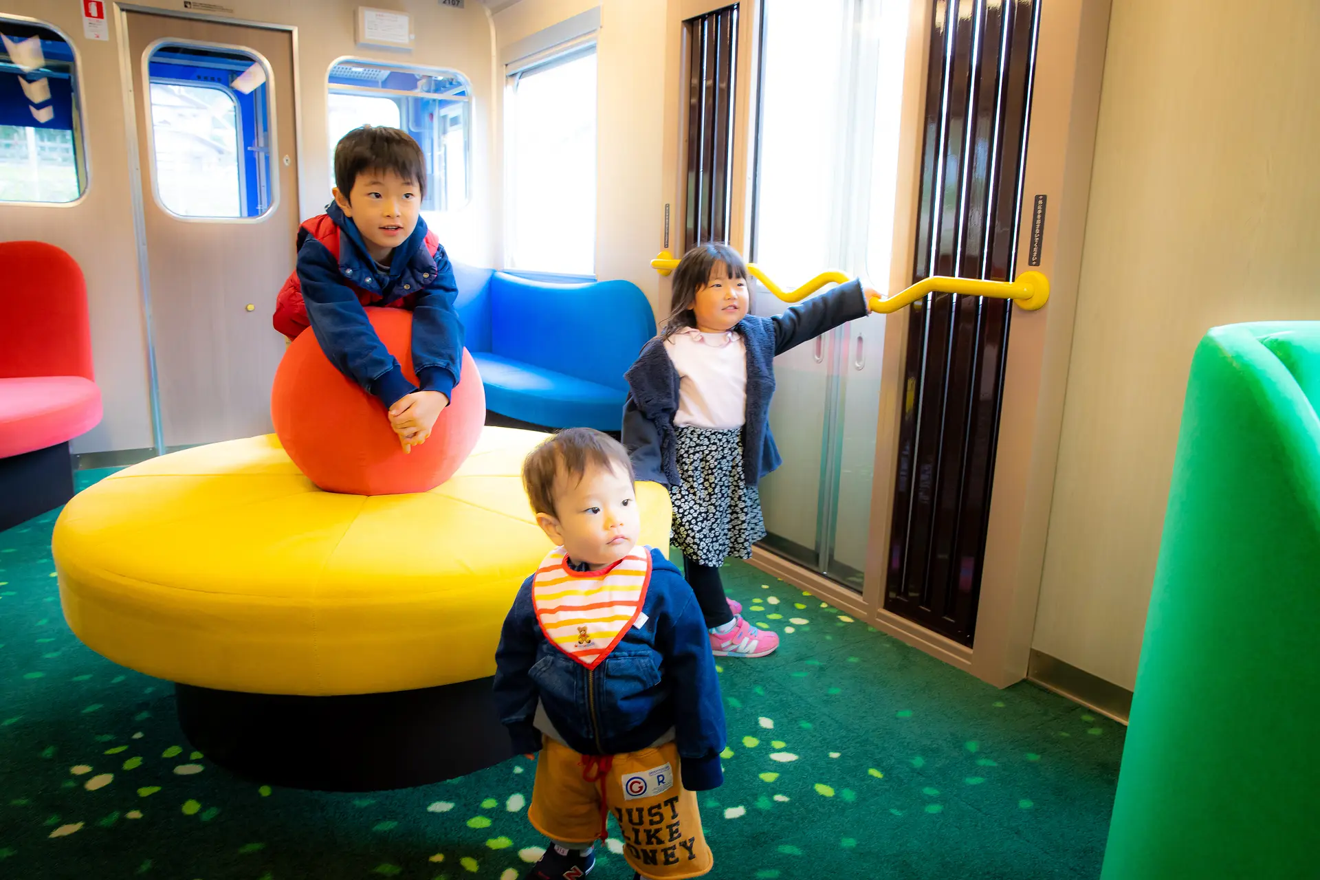 フカフカのじゅうたん、カラフルなクッションや椅子で内部をコーディネート。元気いっぱい飛び跳ねたり、大声を出したりしても車内全体に響かない構造になっています。
