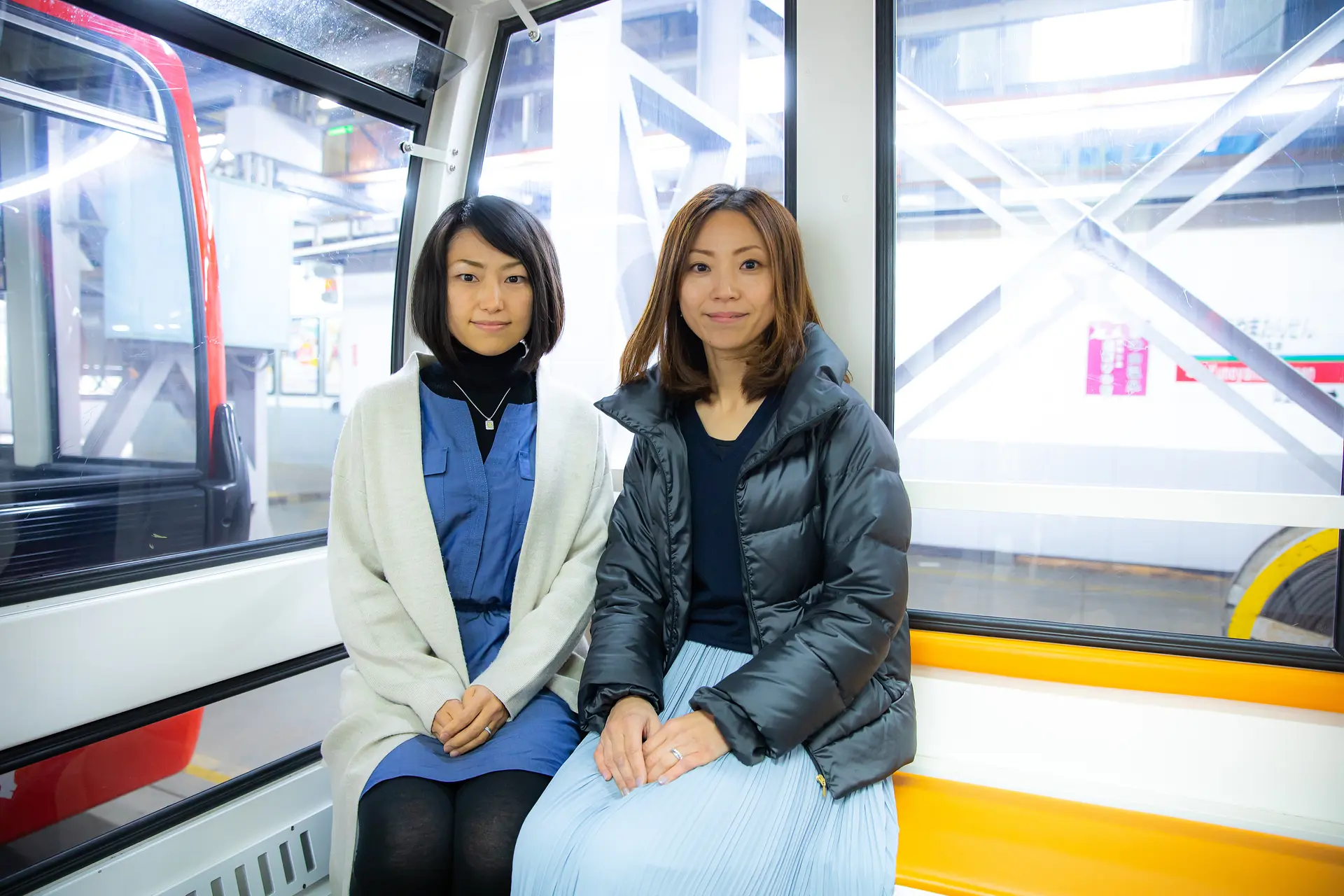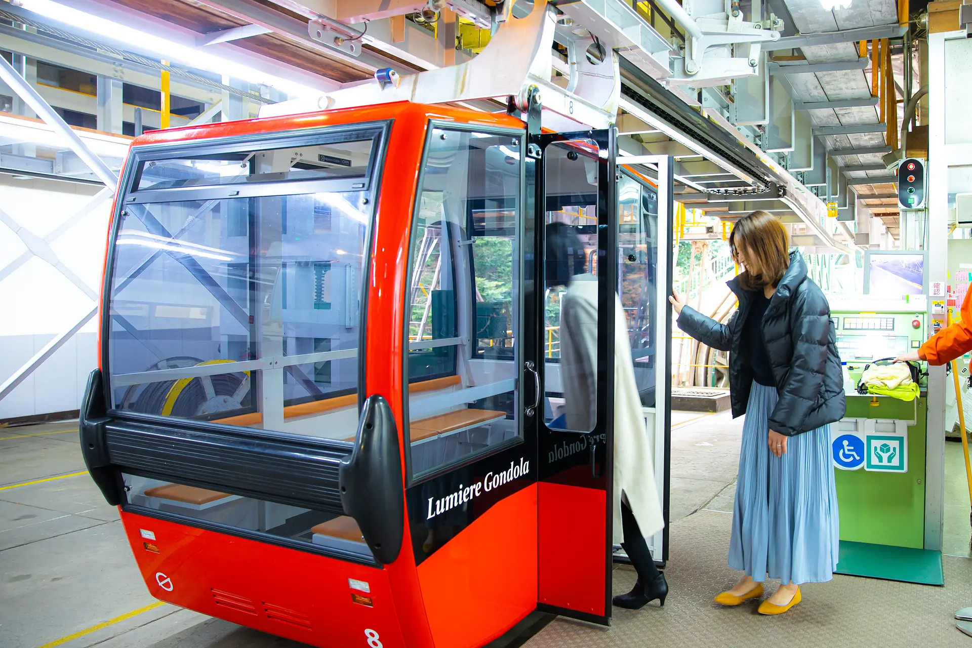2018年に導入されたという新型ゴンドラ「ルミエール」は、鮮やかな赤と黒のツートンカラーと大きくとられた窓が特徴。約1分間隔で次々と発車していく中を、係の人の誘導に従ってゴンドラの中に素早く入ります。