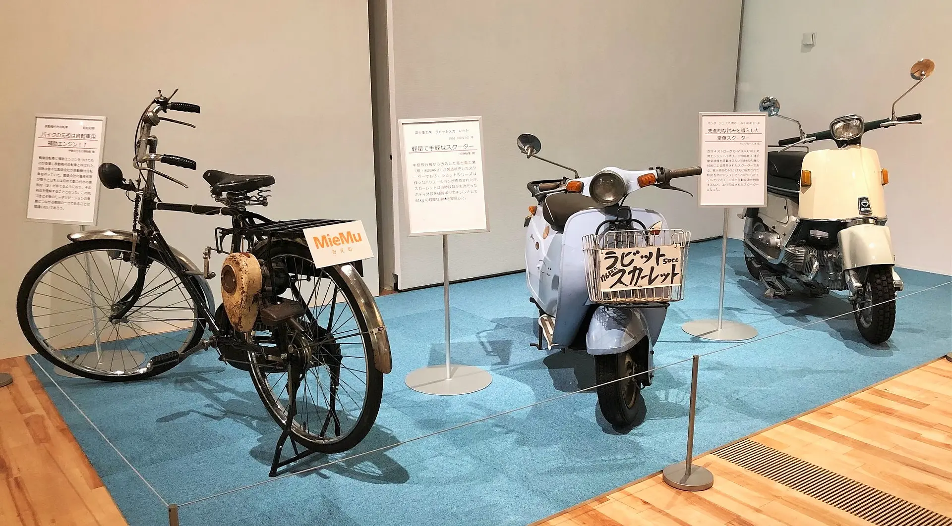 写真の左側にあるのは自転車ですが・・・これは自転車に補助エンジンを付けたもの(いわゆる“原付自転車”)で、バイクの元祖ともいえる姿だそうです。