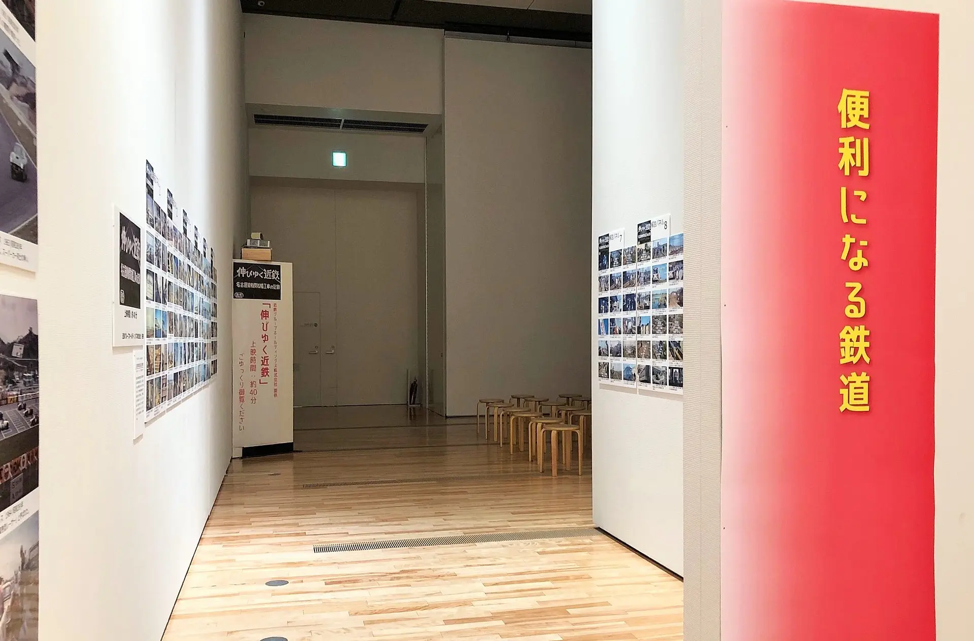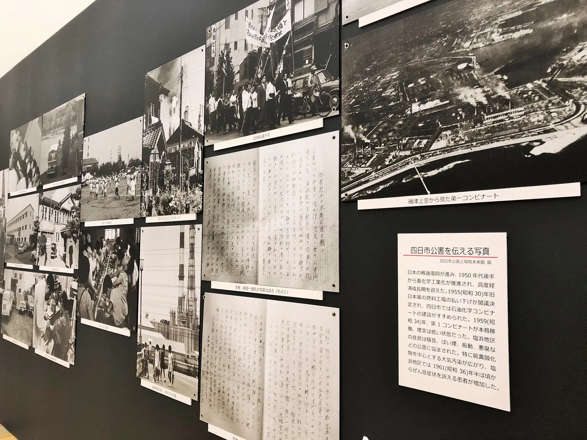 本展覧会では、「四大公害病」のひとつである「四日市公害」を伝える写真パネルが壁一面に展示されていました。