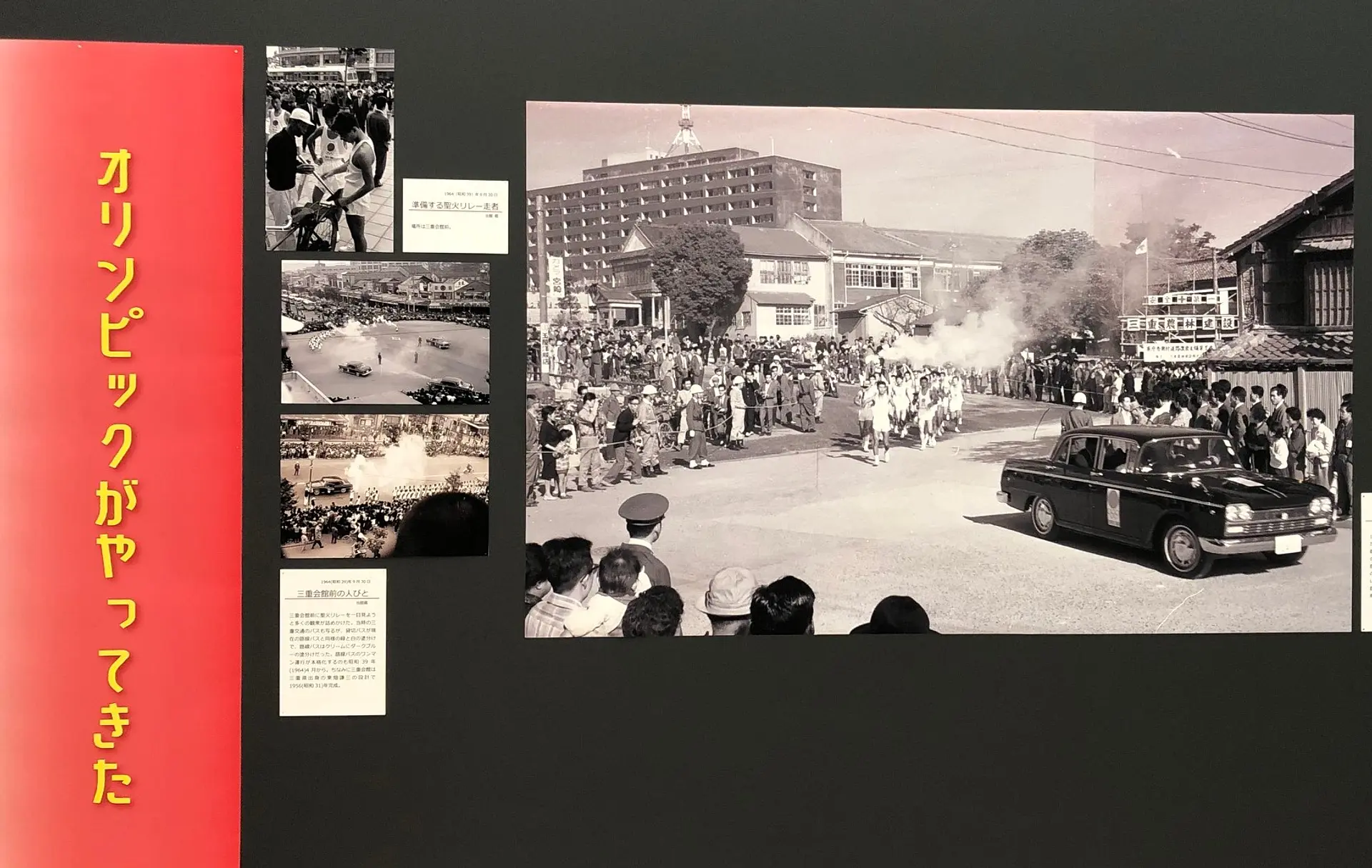大きな写真パネルは三重県庁前での聖火リレーの様子。聖火は1964年9月30日に滋賀県から引き継がれ、鈴鹿峠を超えて亀山を通過、津の県庁で一泊した翌日(10月1日)、鈴鹿→四日市→桑名を通り、多度で岐阜県に引き継いだのだとか。