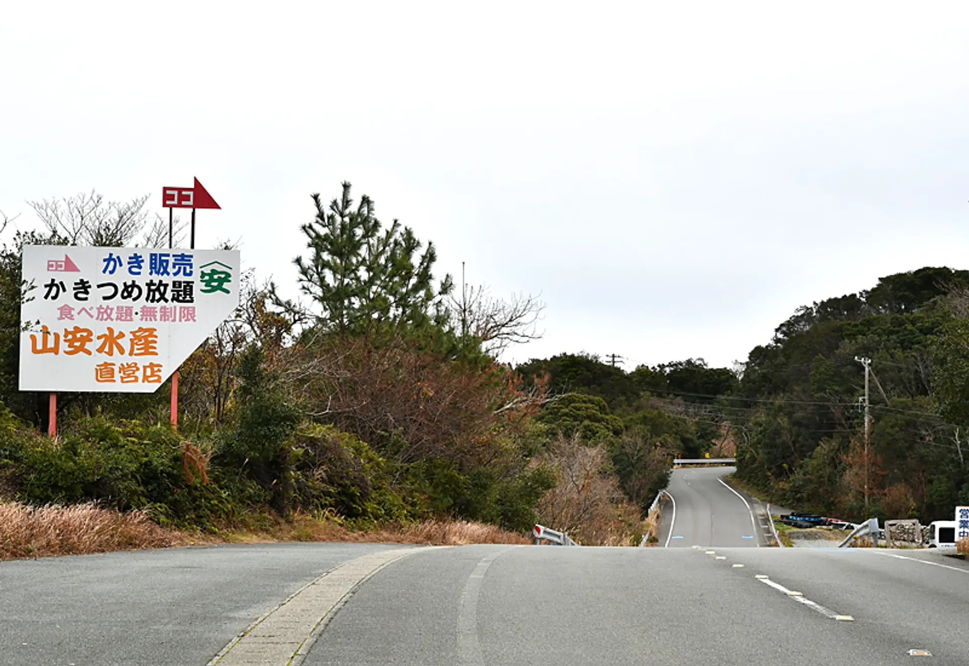 今回の目的地、鳥羽浦村牡蠣食べ放題「山安水産パールロード店」の看板を発見!