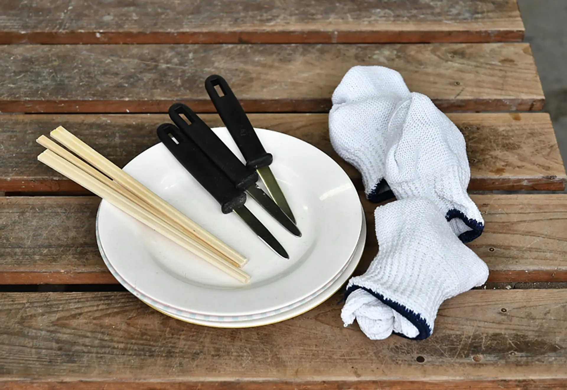食べ放題のセット内容は、お皿、牡蠣むき、割りばし、軍手(てぶくろ)になります。