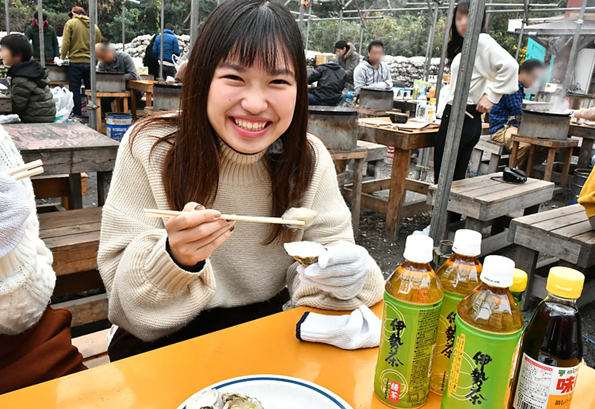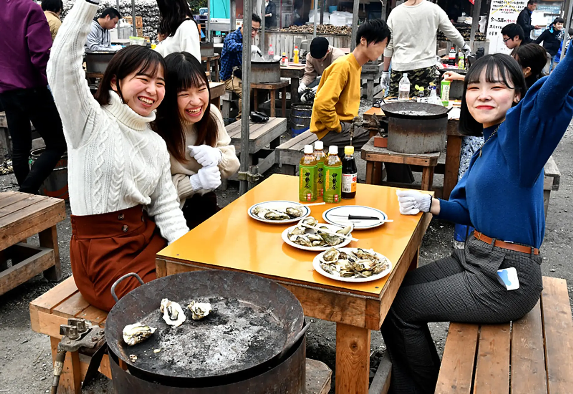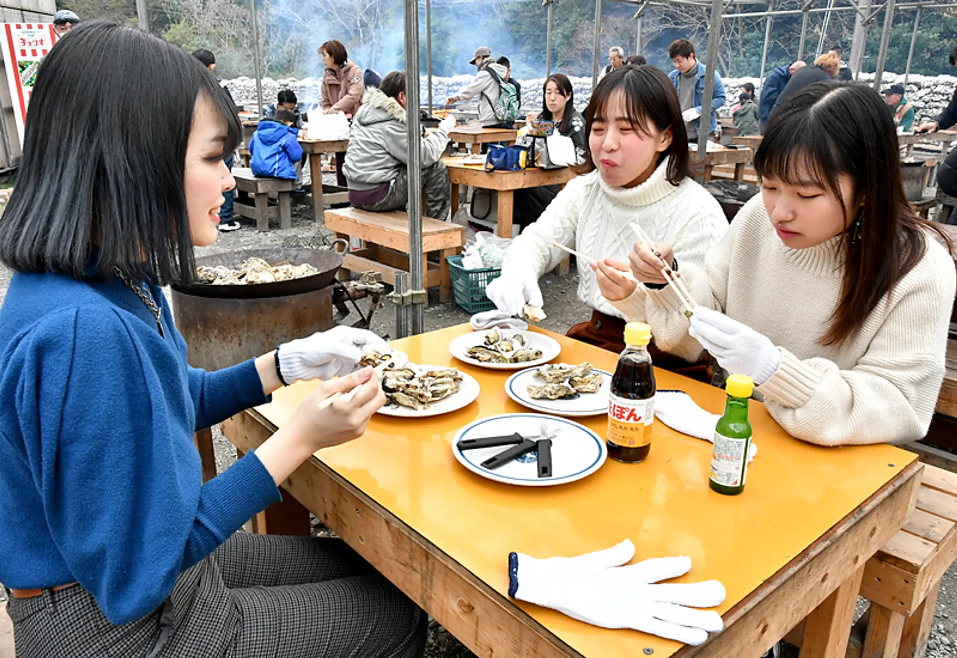 今回は焼き牡蠣ビギナーの女子3人組。煙の少ないガスコンロのテーブルを選びました。