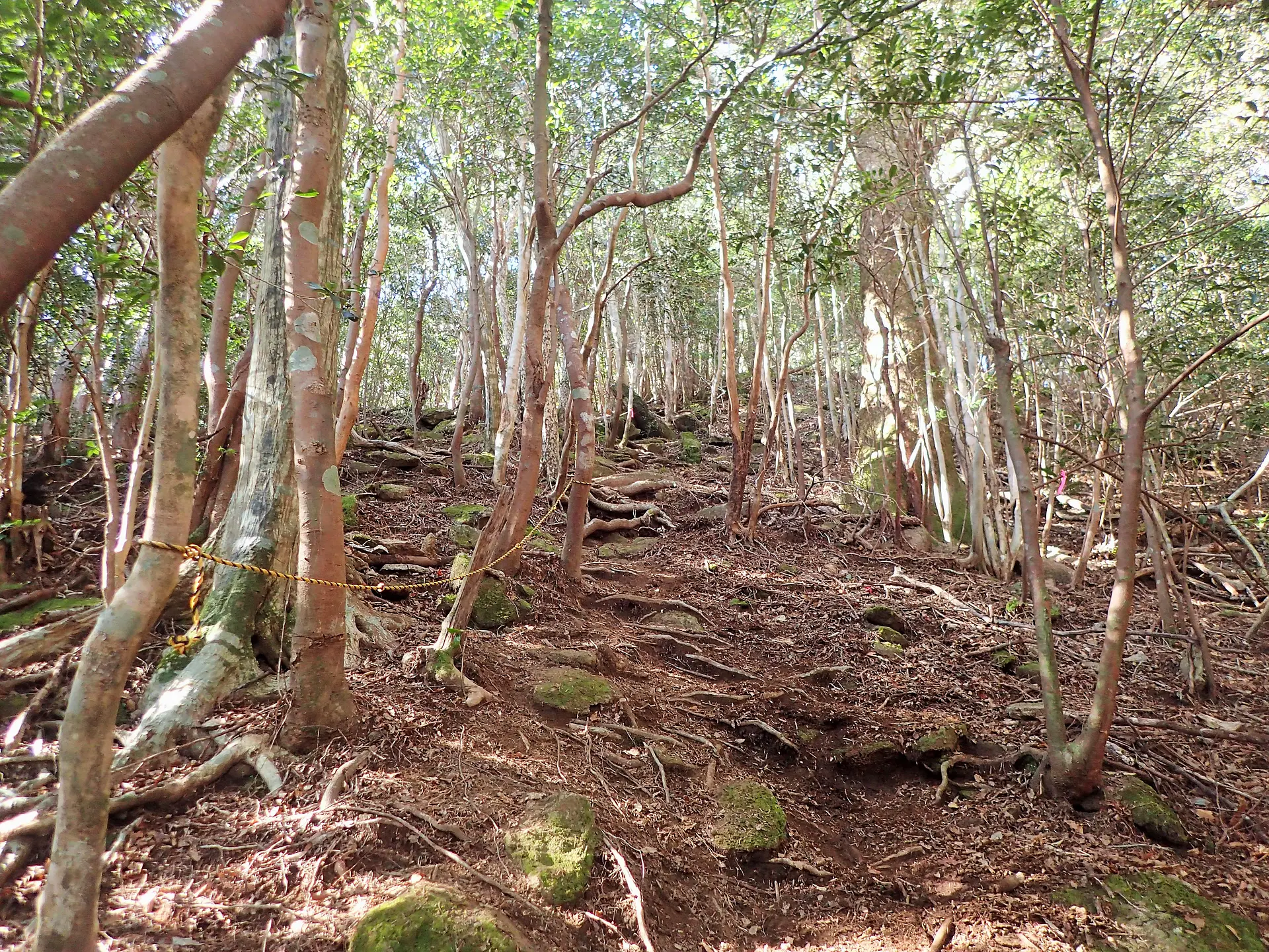 山頂まではペースにもよりますが、1時間30分~2時間ほどの道のり。ハシゴからすぐに急な坂を登っていきますが、やがて尾根に出ると傾斜は比較的ゆるやかになります。目印となるテープなどを確認しながら登ってきましょう。