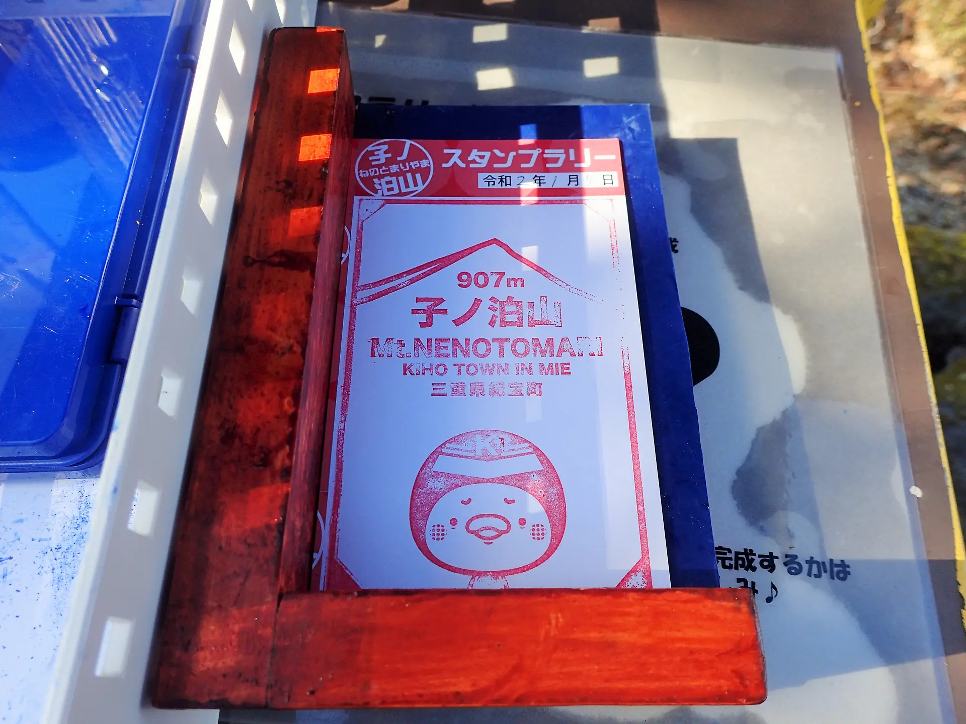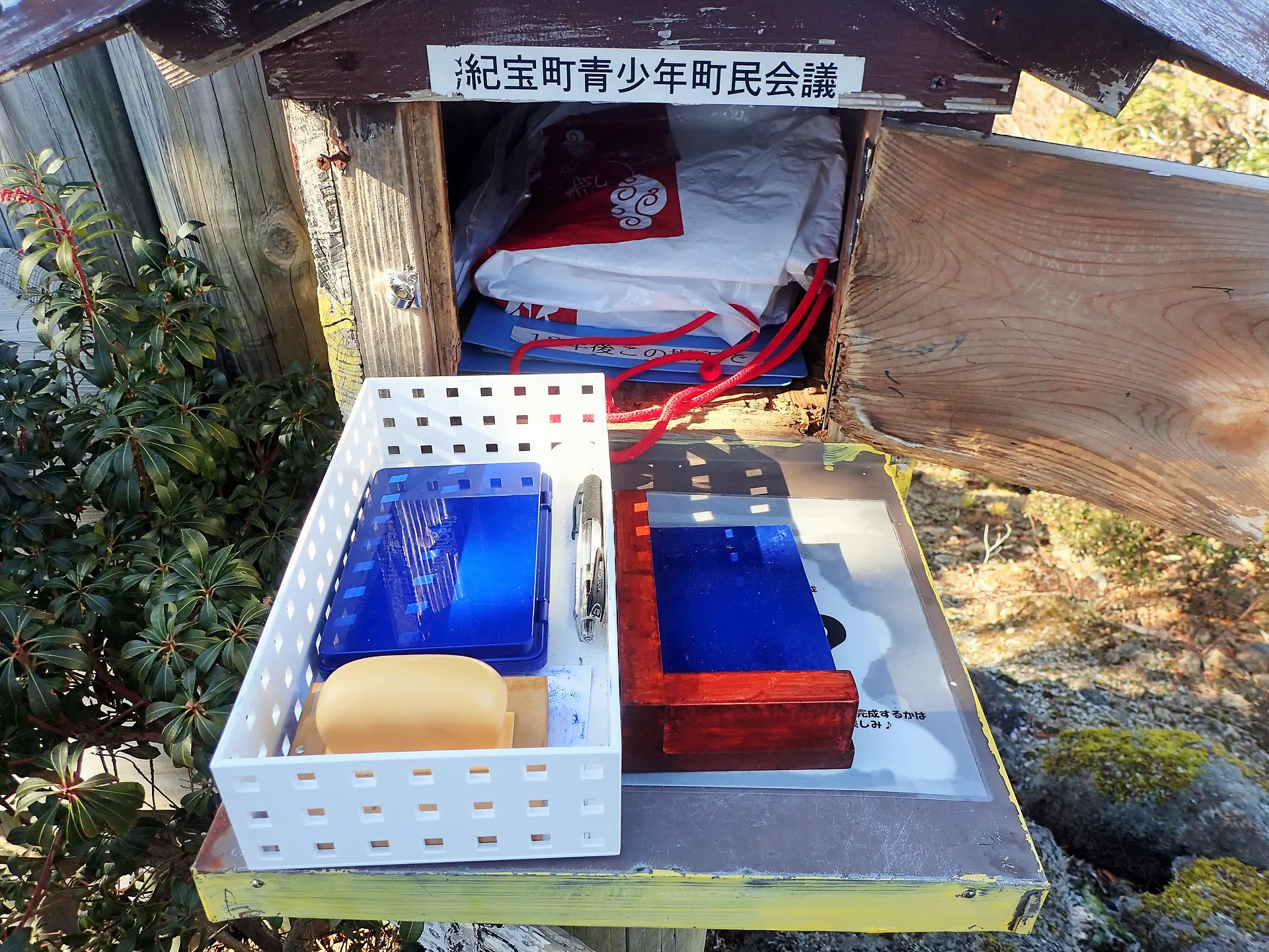 山頂標識のすぐ右手にスタンプ台が設置されています。完成したスタンプシートは、きっといい思い出になりますよ。