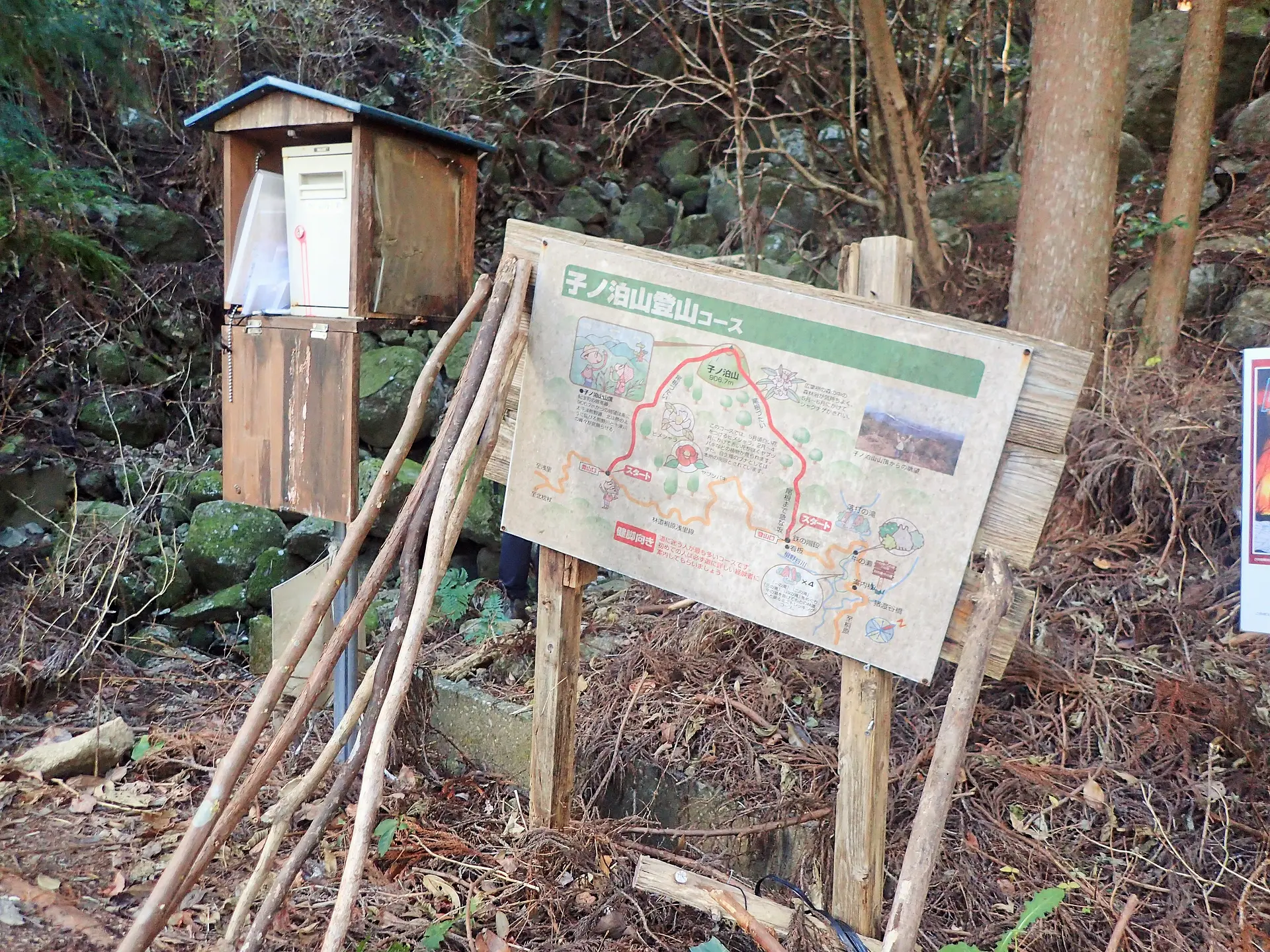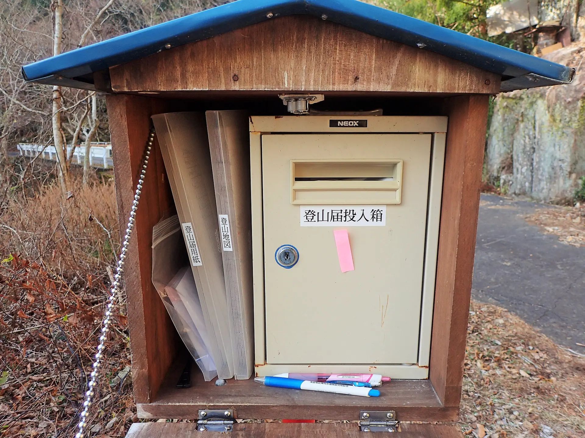 登山口には登山届の用紙と提出ボックスが設置されています。登山届の様式は、紀宝町のホームページでダウンロードすることもできますので、事前に準備しておくのもよいでしょう。当日、時間の節約にもなりおすすめです。