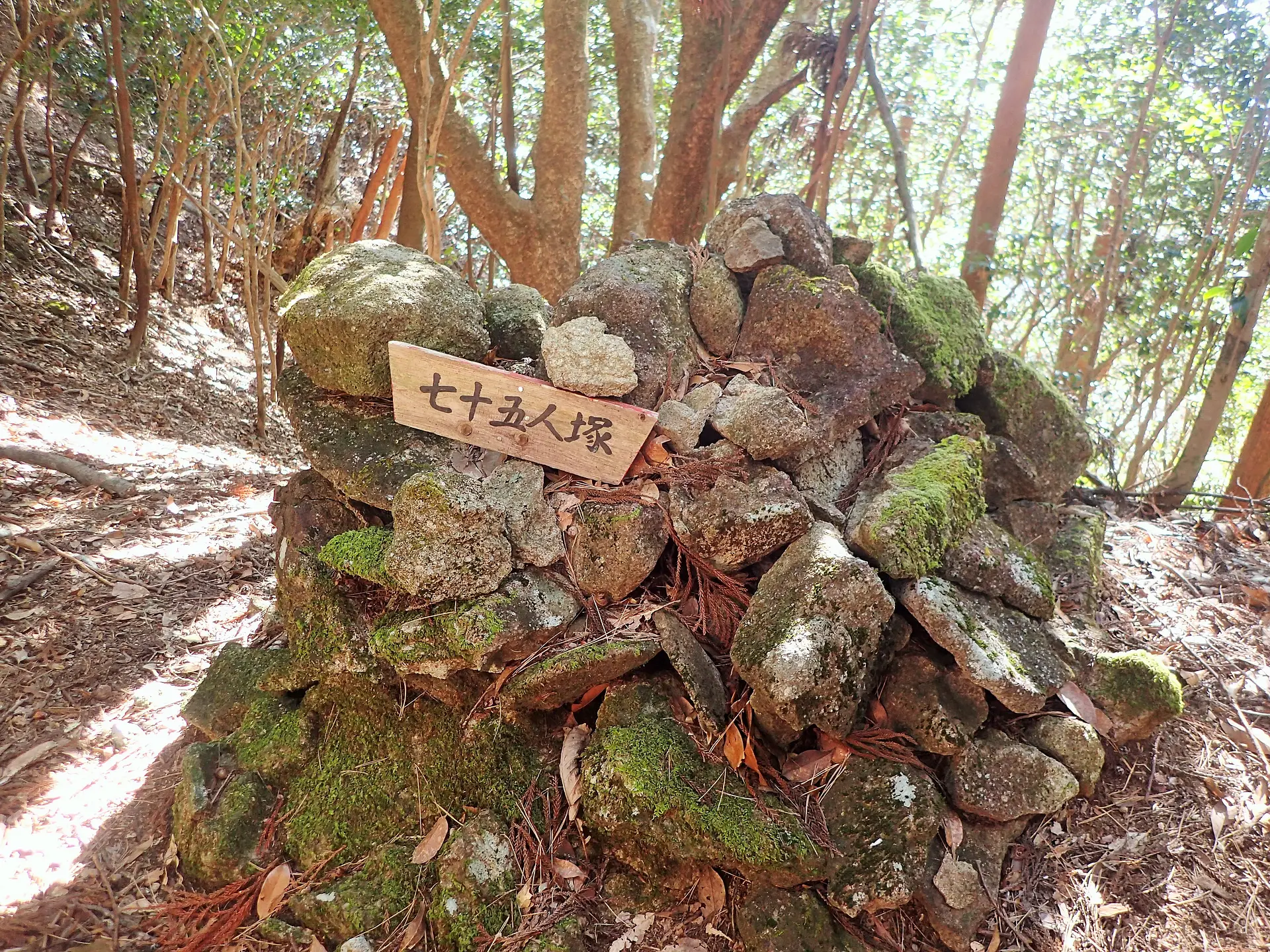 すると、「七十五人塚」と呼ばれる塚を発見!これは、子ノ泊山へ家臣とともに逃れたといわれる平家の落武者・赤井蔵光の家臣を葬ったものと伝わっています。
