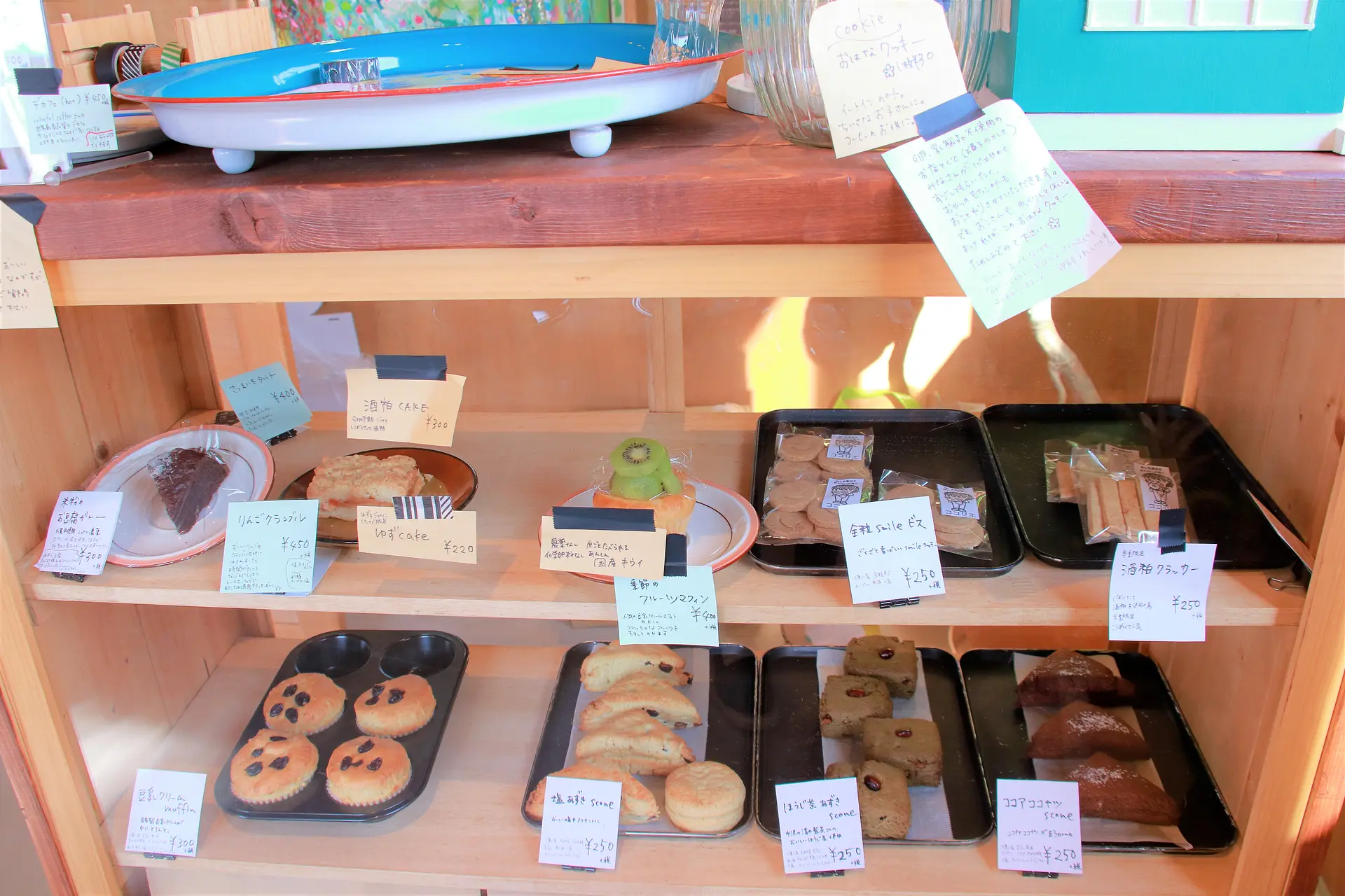 マフィン・スコーン・クッキー・ケーキ・タルトなど、8~10種ほどのお菓子が並んでいます。店主がひとりで仕込みからすべてを担当。子育ての時間も大切にしつつ、家族からのサポートも得ながら毎日数多くのお菓子を手作り・販売しています。