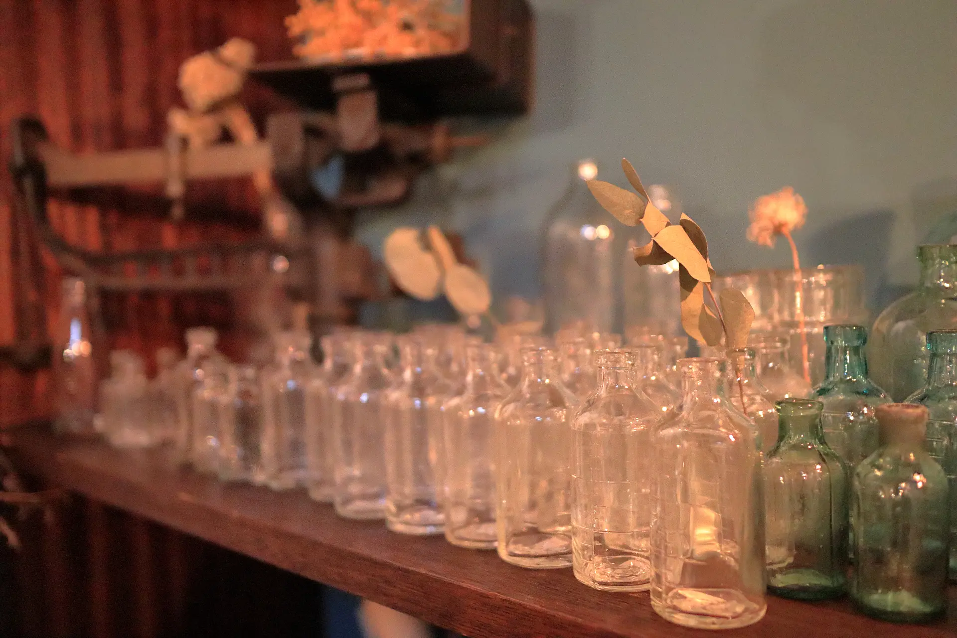 可愛らしい小瓶は、昭和初期前後の薬瓶。当時は実用的に使われていたのかもしれませんが、こうして並べると全く異なる印象を与えてくれます。店内の優しい光に包まれて、ノスタルジックな雰囲気に。