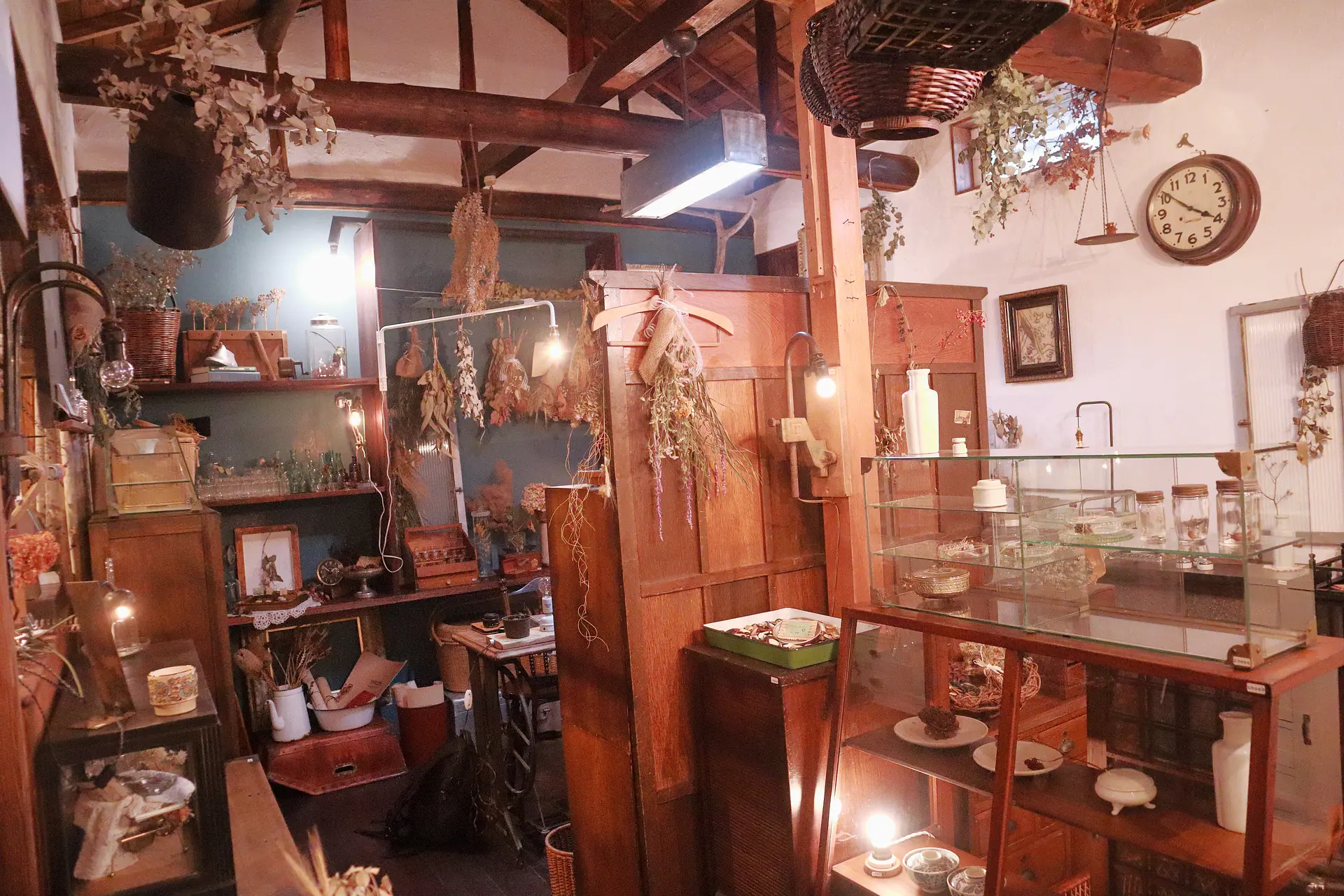 店内の装飾はすべて店主のアイデア。どの一角も、まるでどこかで見たドラマのワンシーンのようです。古道具や雑貨と一緒に飾られたドライフラワーは、すべて店主の手作り。古道具や雑貨よりもたくさん売れる、密かな人気商品です。