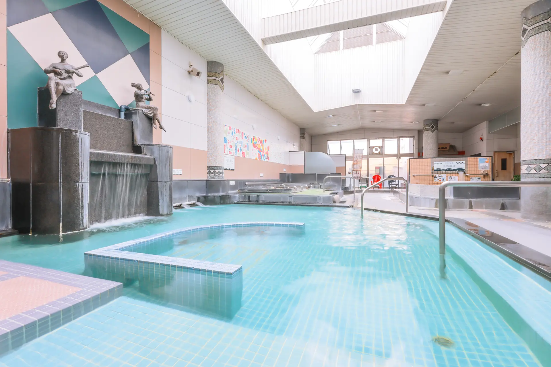 ジェットバス、源泉風呂、電気風呂、炭酸泉、不感温泉など、さまざまなお風呂が楽しめる浴場。天井からは柔らかい日差しが降り注ぎ、ゆったりとくつろげる雰囲気です。