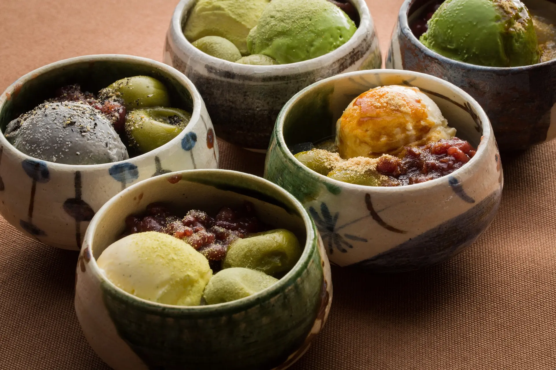 特選抹茶金時のかき氷(770円/税込)のほか、黒蜜きな粉や白玉あずきなど5タイプから選べる「てまりパフェ」(594円~/税込)が人気を集めています。